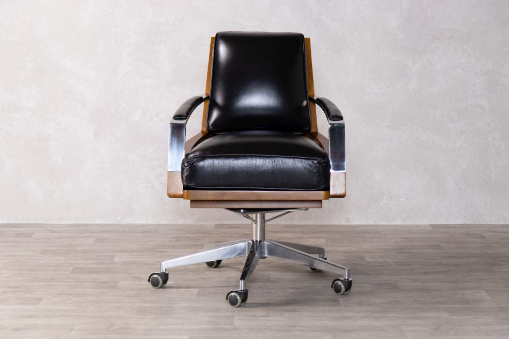 The prestigious Jackson Chair is superbly finished with full leather and a medium walnut hardwood frame. Influenced by the 1930s art deco style of 1930s cruise liners, this chair is perfect for an elegant study.