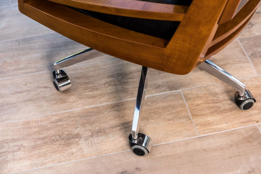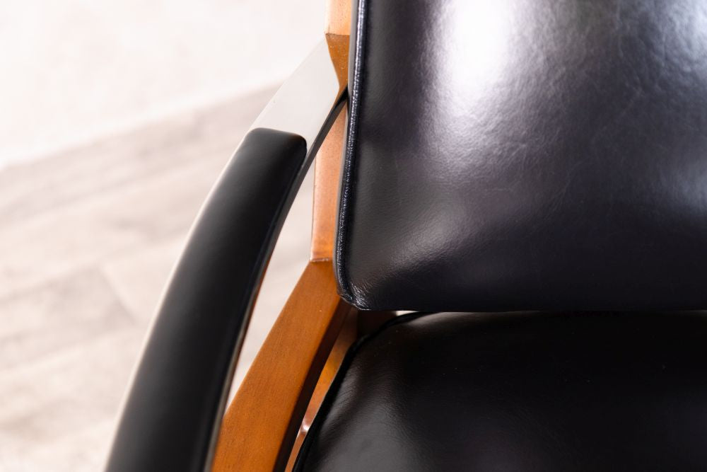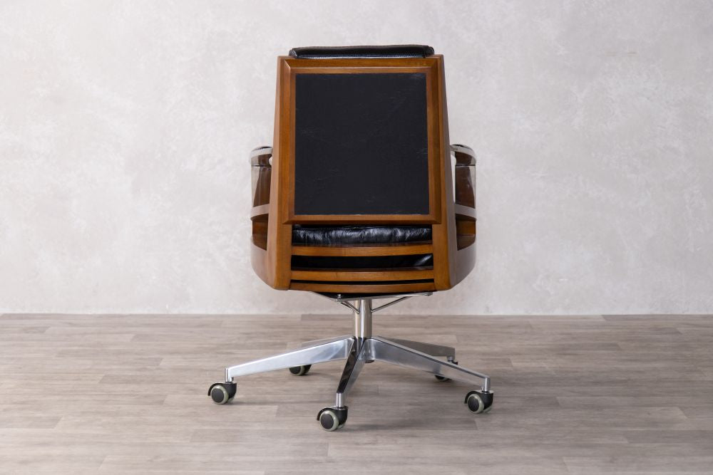 The continental-style study set features a full leather chair with black inserts running through the middle. The chrome sides of the desk has three shelves for books and files, and boasts three dummy drawers to the top. The mix of leather, walnut and chrome in both office chair and desk is the perfect blend of sophisticated glamour.