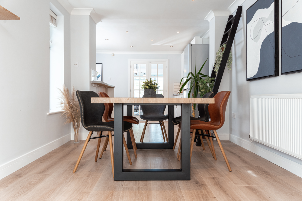Finished with an oak effect top and gunmetal steel legs, the Kent Industrial Dining Table will bring a modern touch of industrial character to your home.