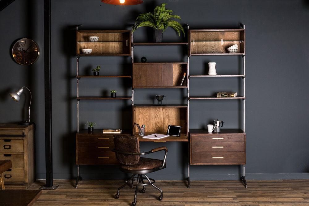 The large shelving unit has multiple shelves, cupboards and drawers. It is ideal for storing and displaying items, and can even be used as a desk.