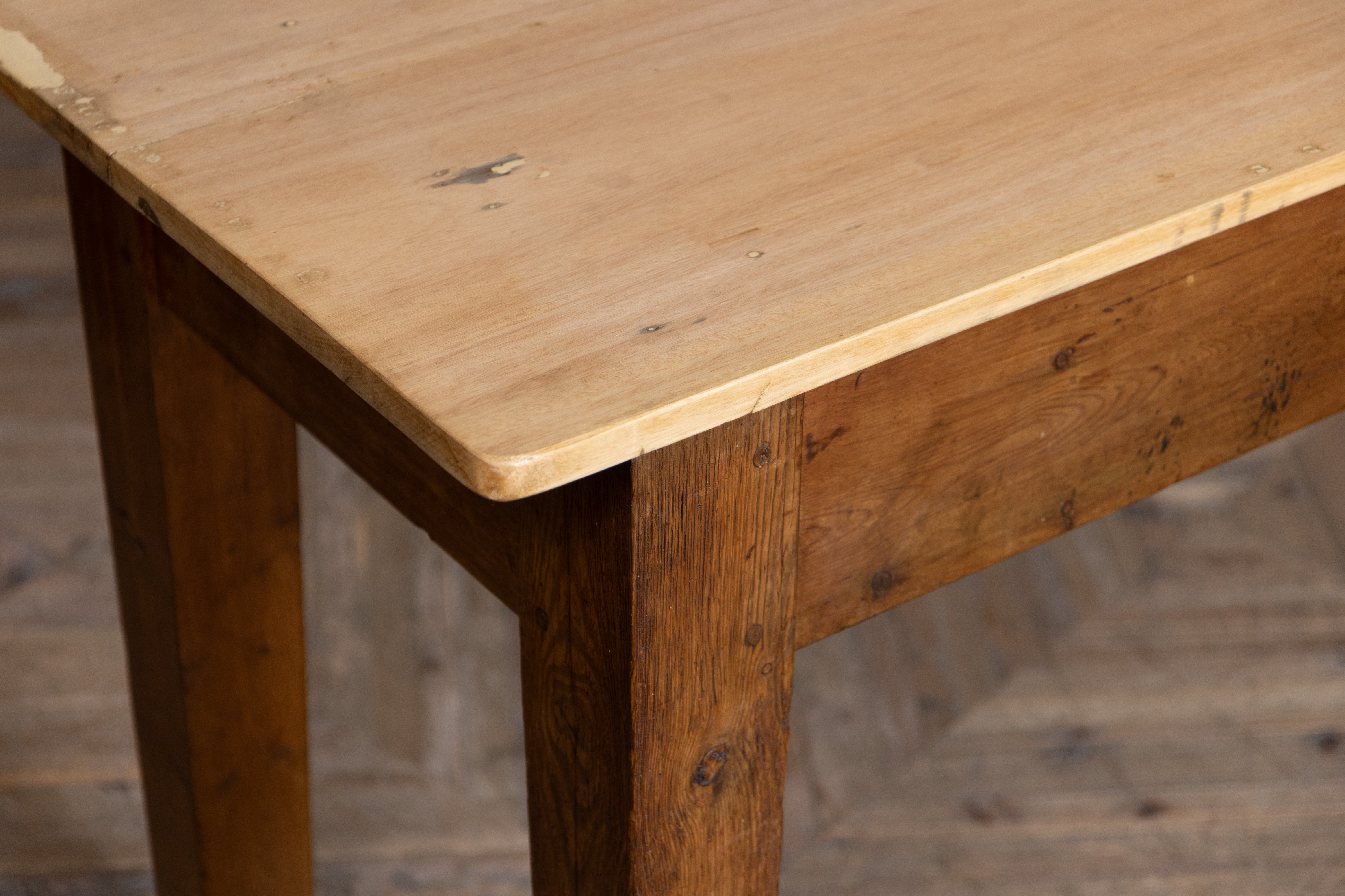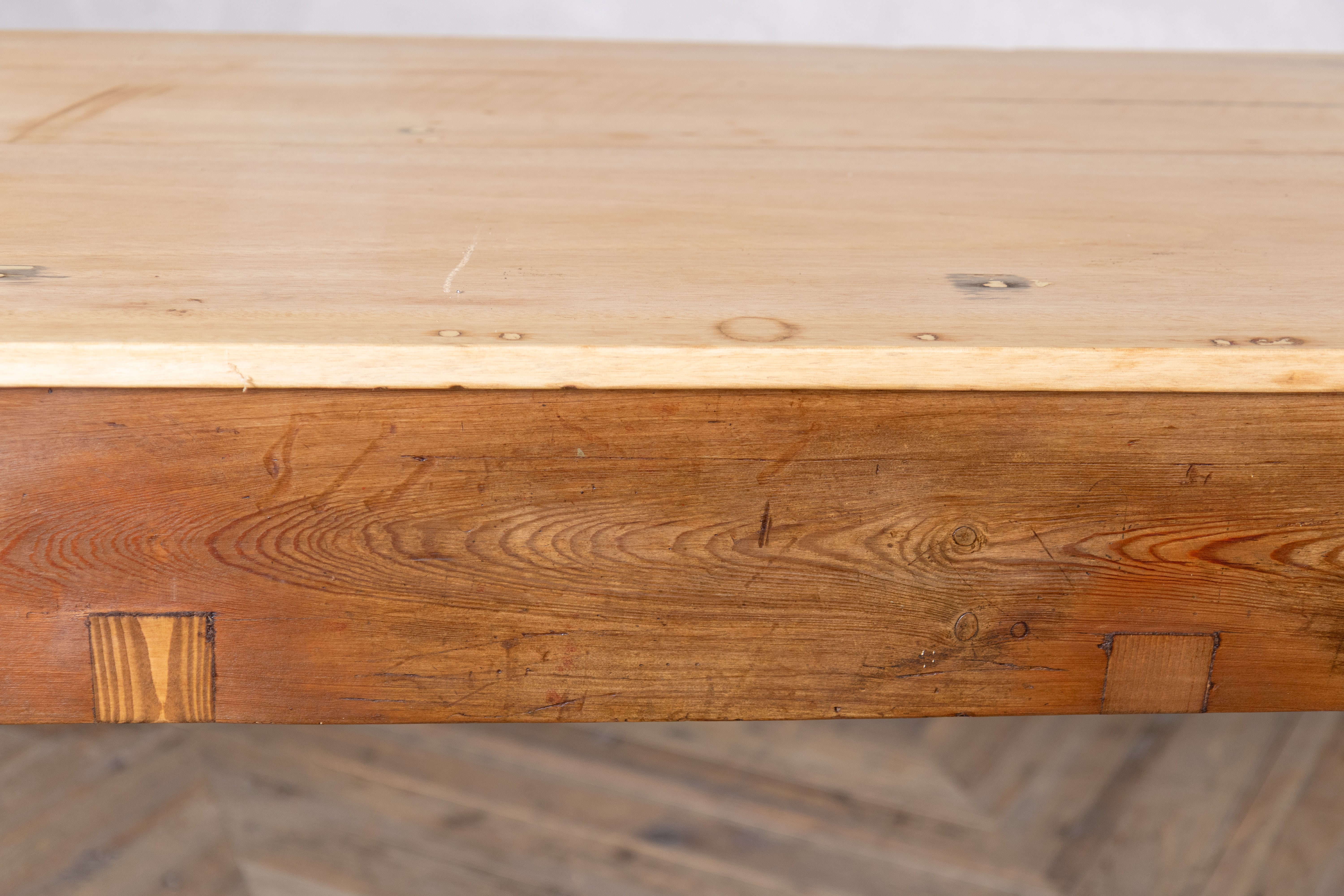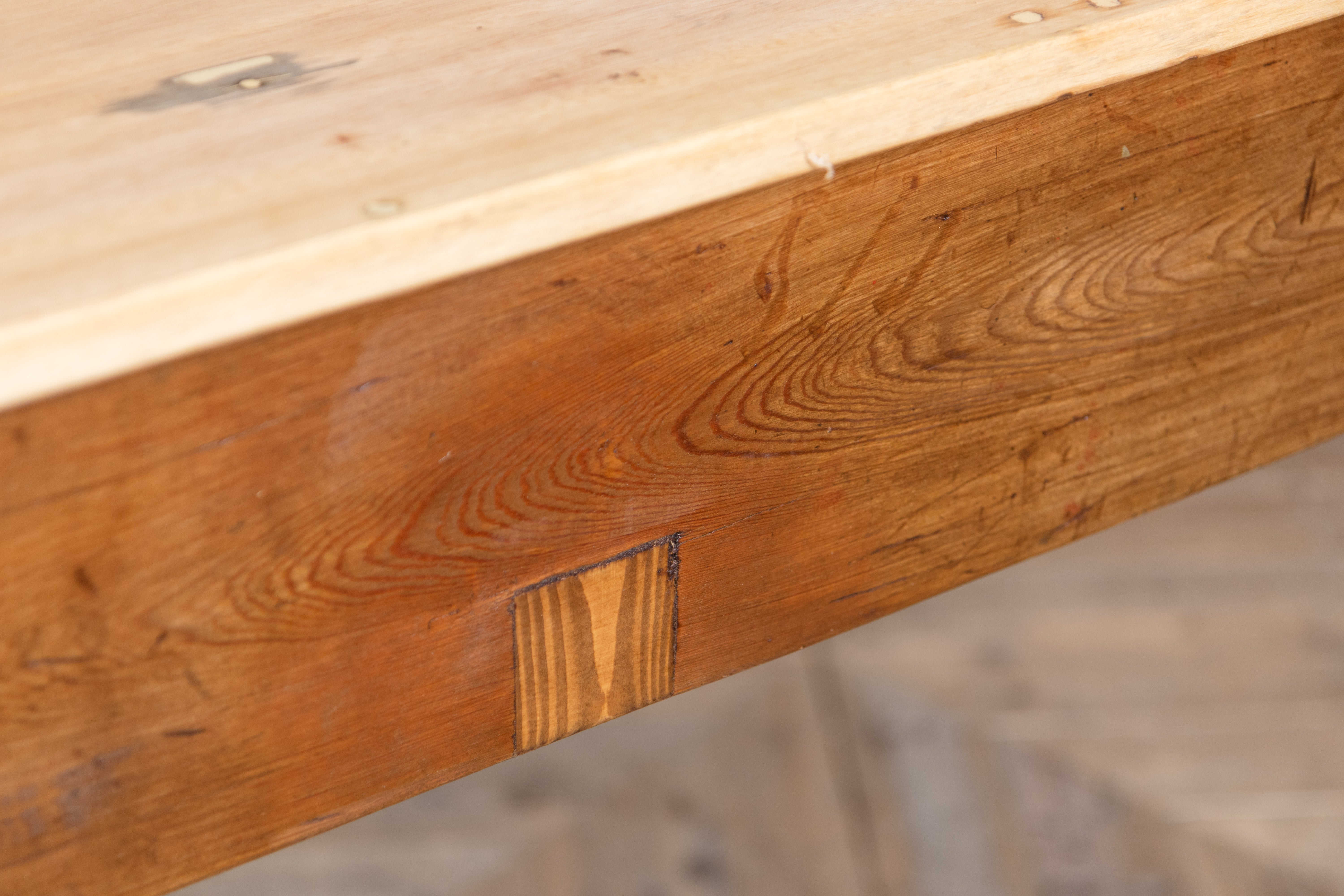 This Wooden Workbench is a versatile statement piece with a pine base and a durable hardwood top, rich in patina and grain for lots of character; ideal for bar or restaurant areas with stools around it, and equally suited as a large posing table or serving table for events, pop‑ups, studios, or home entertaining, offering generous surface space, sturdy construction, and an authentic, timeworn look that elevates both practical tasks and display.