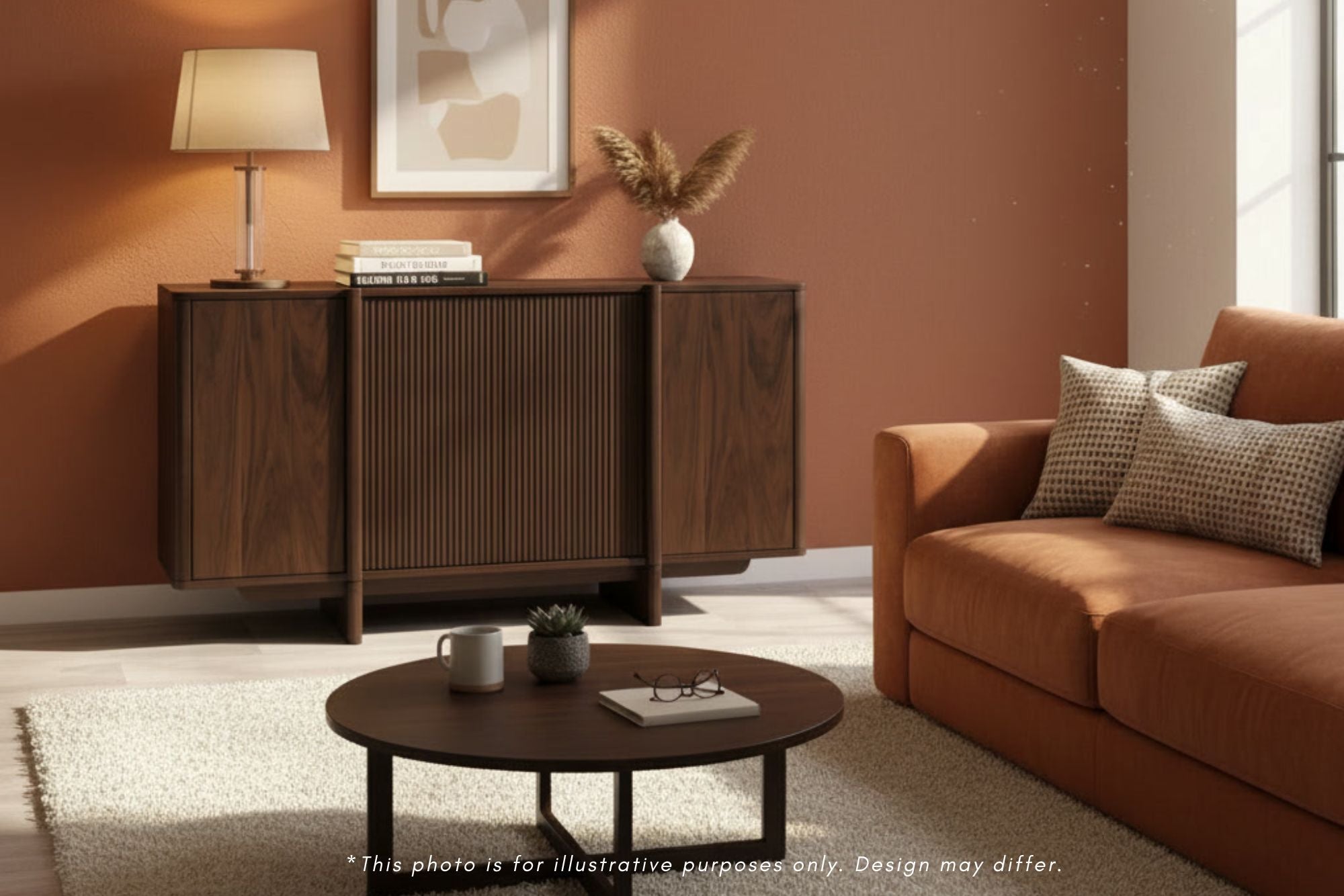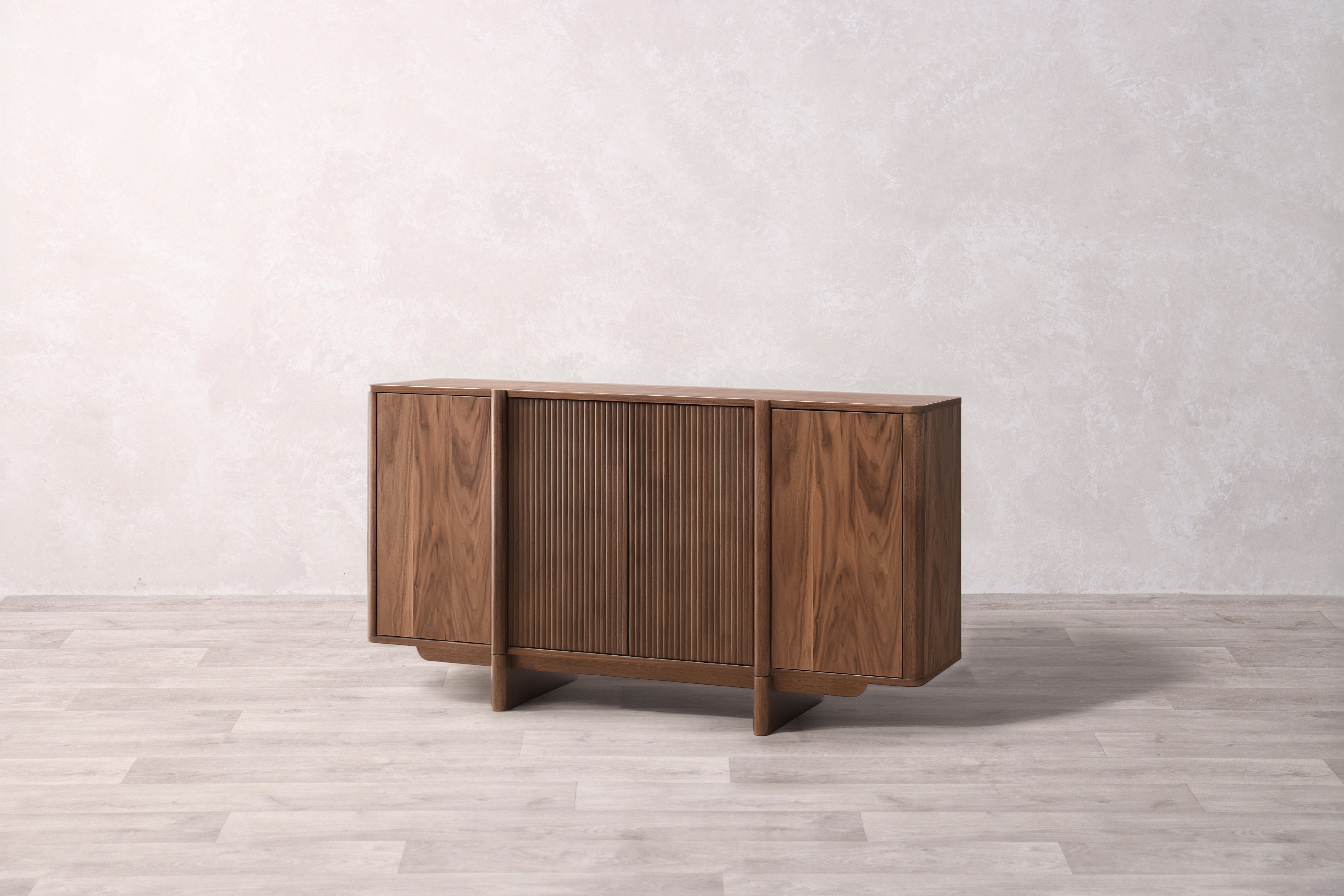 The Layla Sideboard, crafted from solid hardwood with a warm walnut finish, features a textured ribbed centre panel and smooth cabinet doors that showcase the natural grain of the wood. The sculptural base creates a floating effect while providing stability and visual weight. Inside, generous storage space accommodates various essentials, keeping them organised and out of sight. With its clean lines, tactile surface variation, and bold geometric foundation, the Layla functions equally well in dining rooms, living spaces, or hallways.