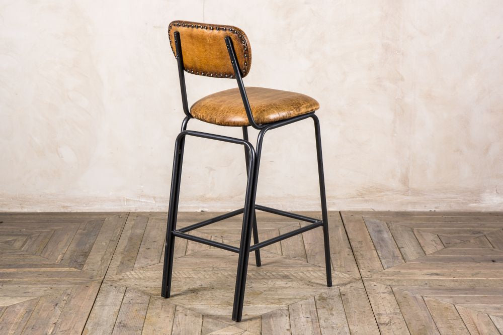 This commercial quality bar stool features a full tan leather upholstery to the back and seat, and is beautifully finished with aged studs to the rear – a lovely feature when placed around a table or positioned at a bar.