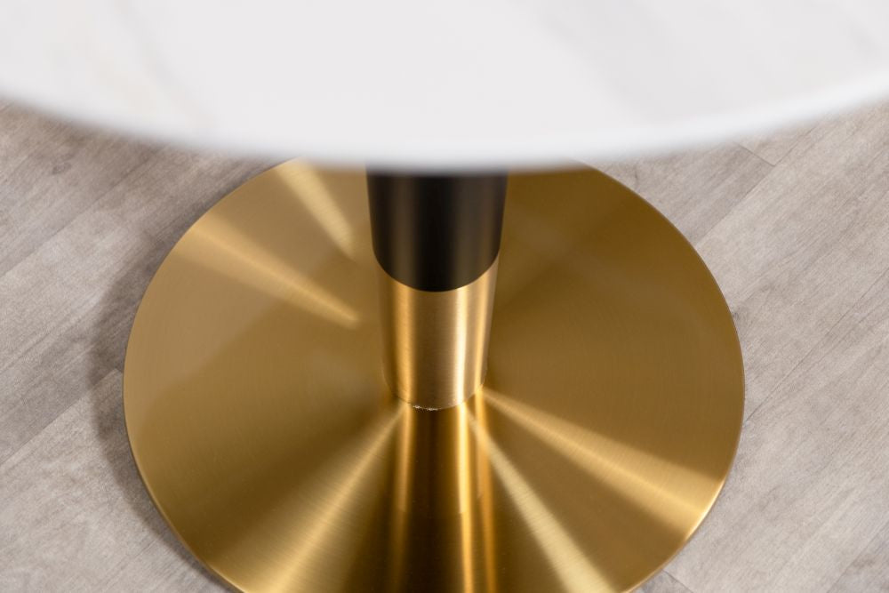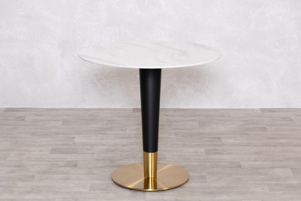 Stylish yet elegant, our Light Porcelain Marble Café Dining Table could be just what you are looking for. Perfect for a swanky Italian pizzeria or an upmarket coffee shop, these contemporary tables are beautifully made with stimulated Carrara marble on the top, a powder-coated column and a brass base.