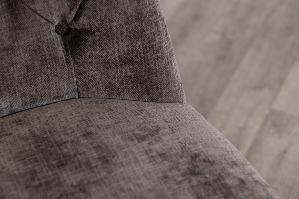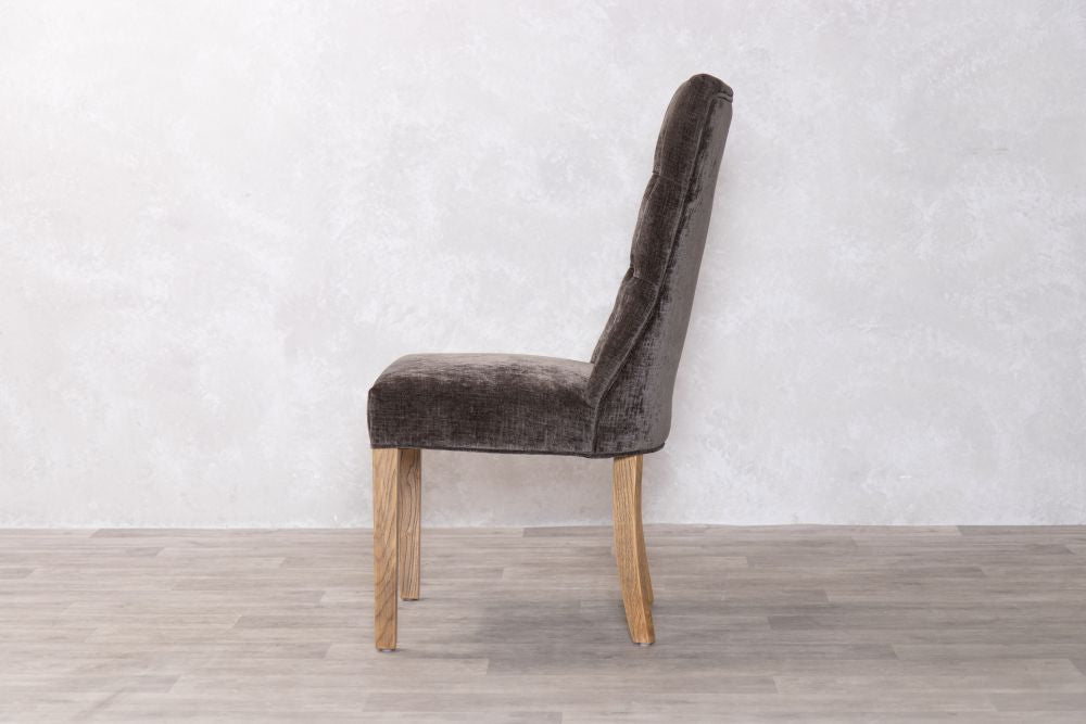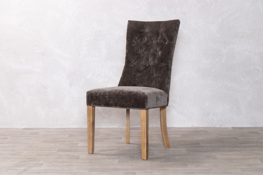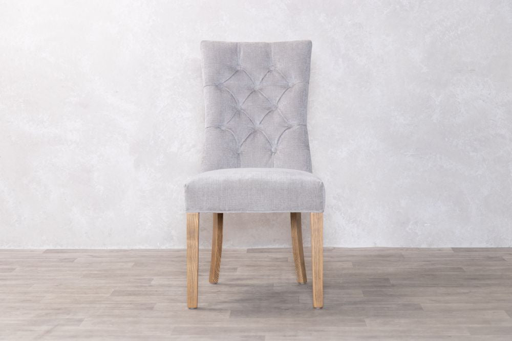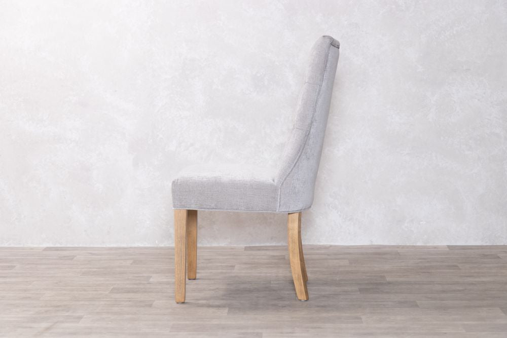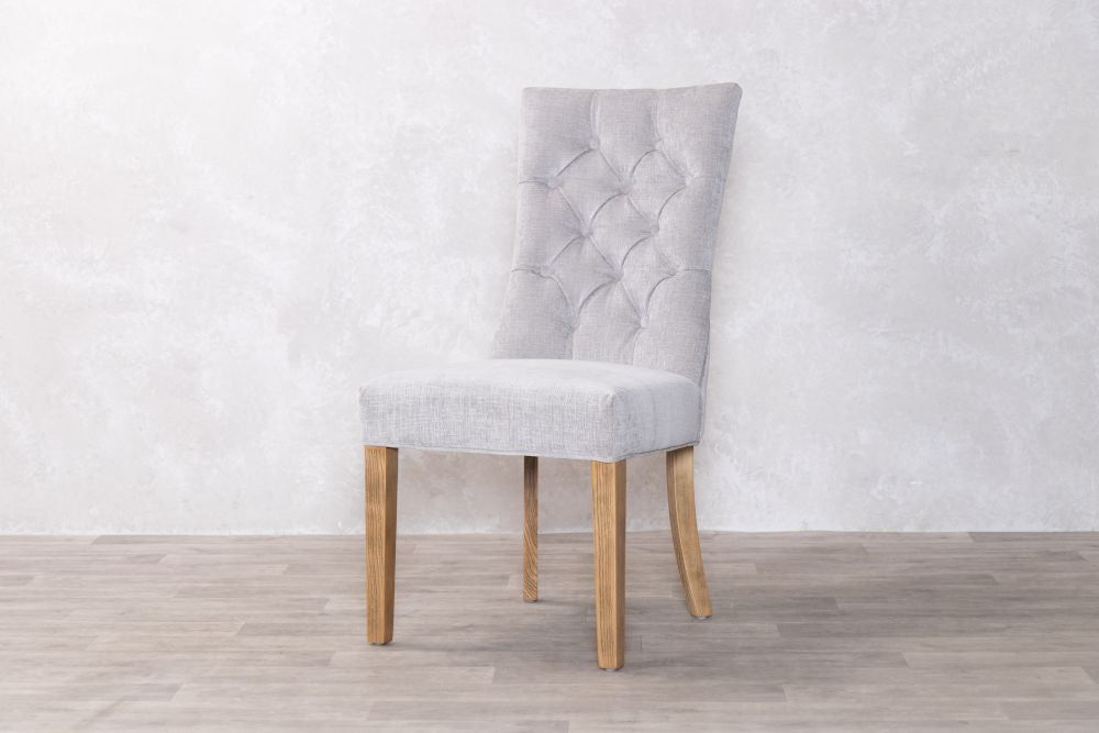 Our mixed chenille upholstered chair features delicate button back detailing and the exposed timber to the legs has a limed, distressed look that brings rustic naturalness to this exquisite dining chair.