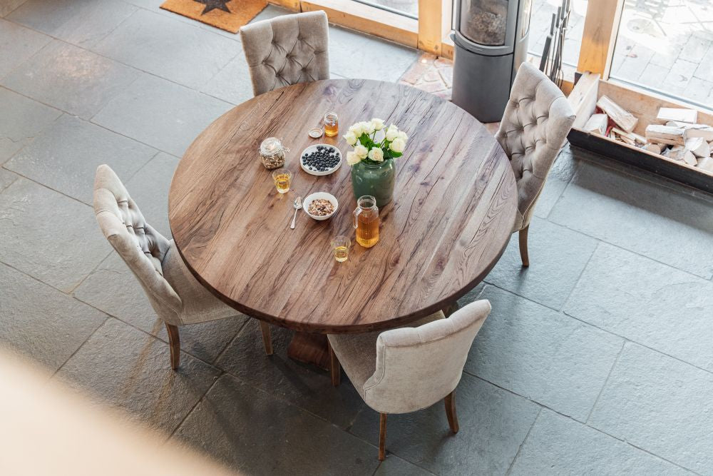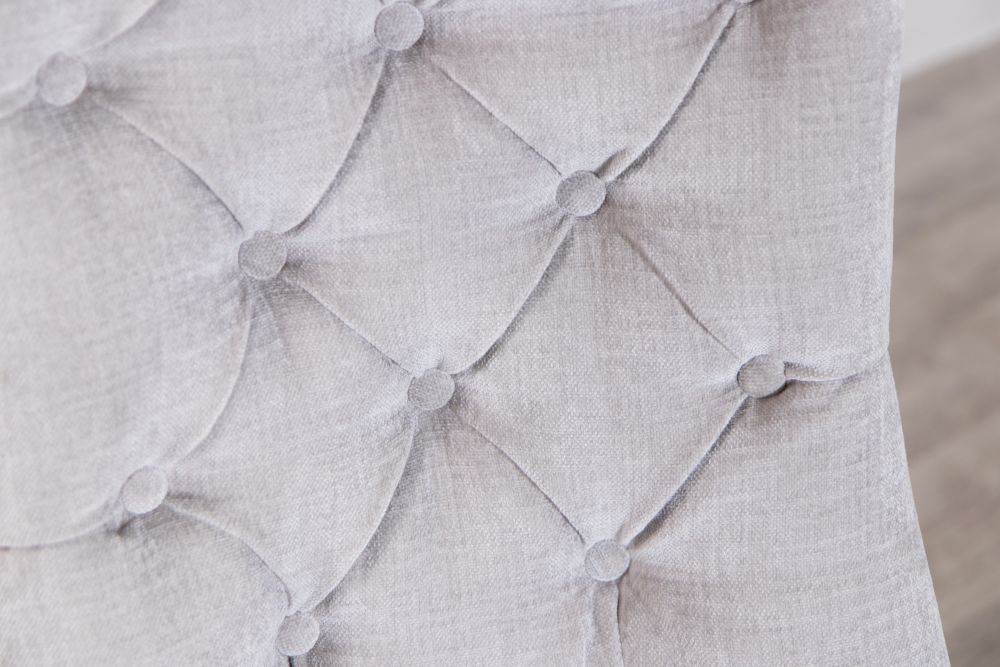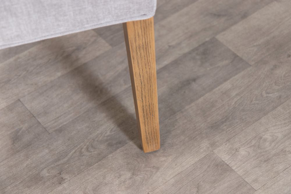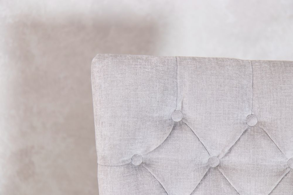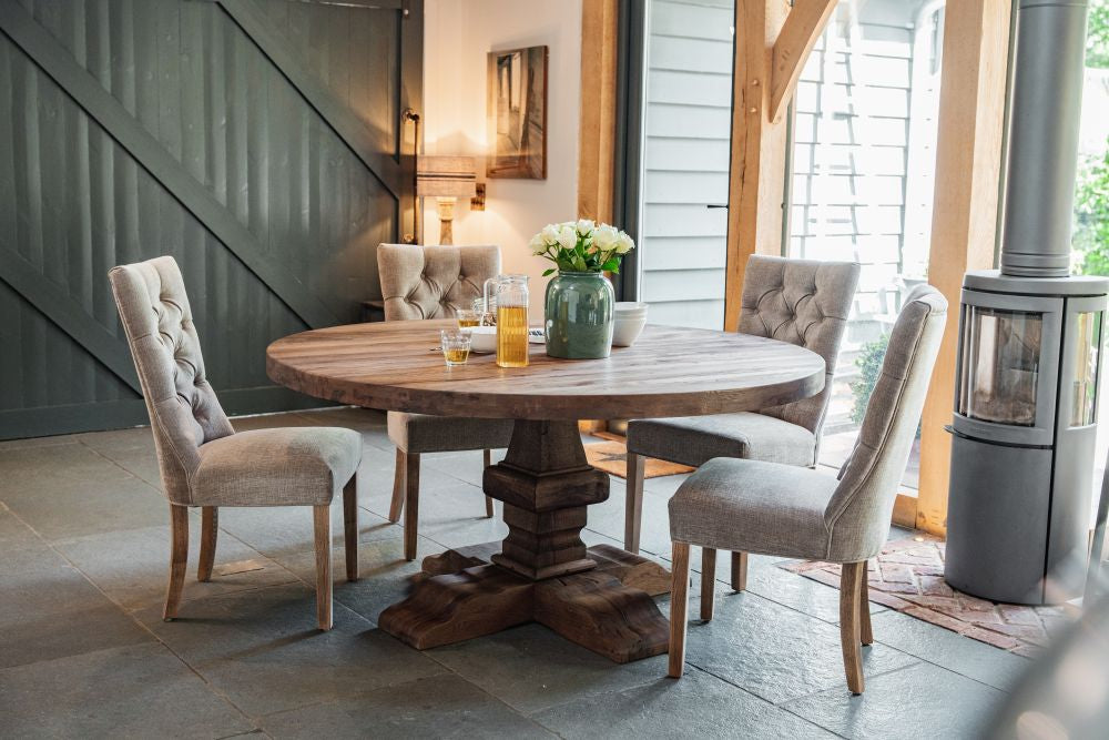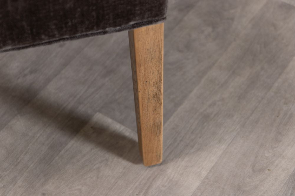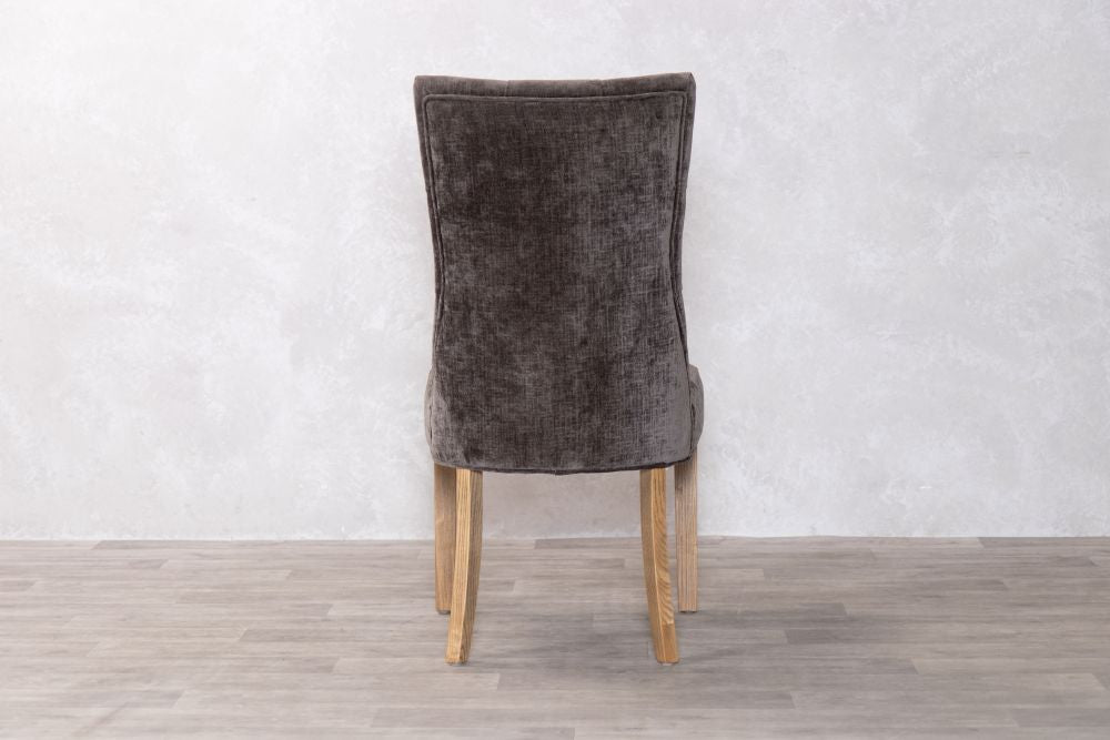 Our mixed chenille upholstered chair features delicate button back detailing and the exposed timber to the legs has a limed, distressed look that brings rustic naturalness to this exquisite dining chair.