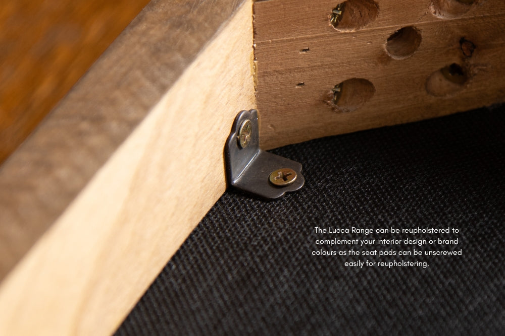 The Lucca Range can be reupholstered to complement your interior design or brand colours as the seat pads can be unscrewed easily for reupholstering.