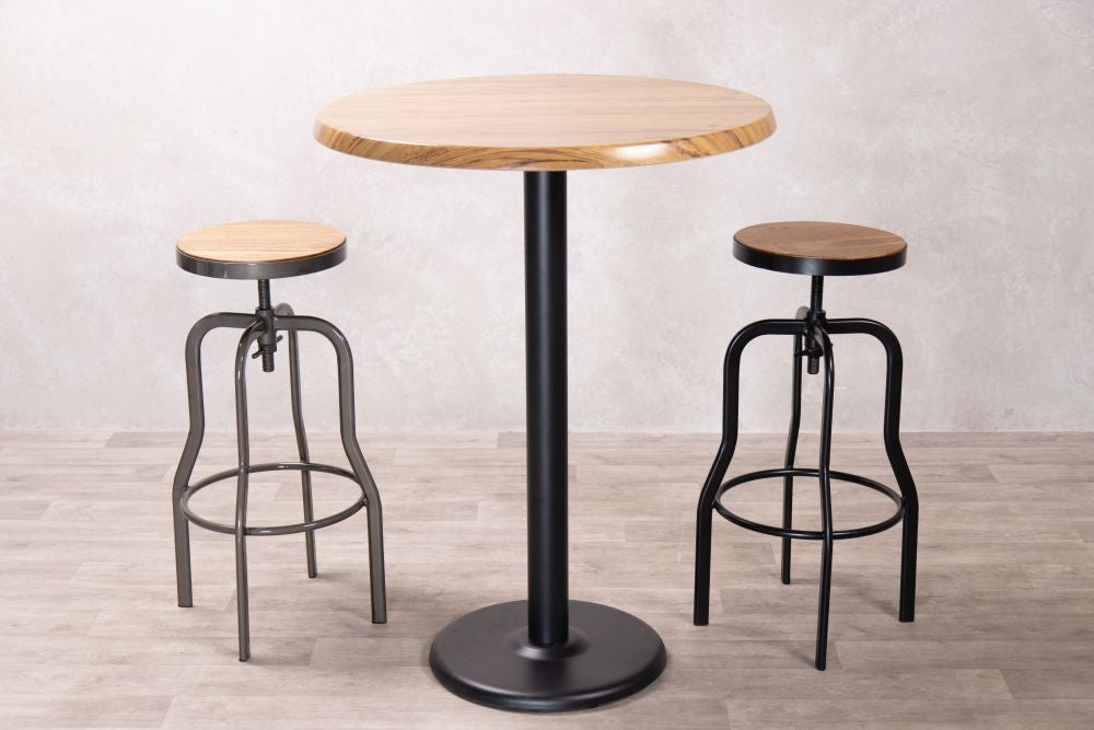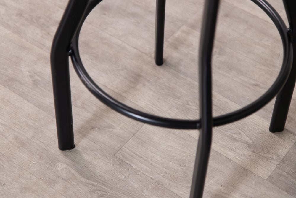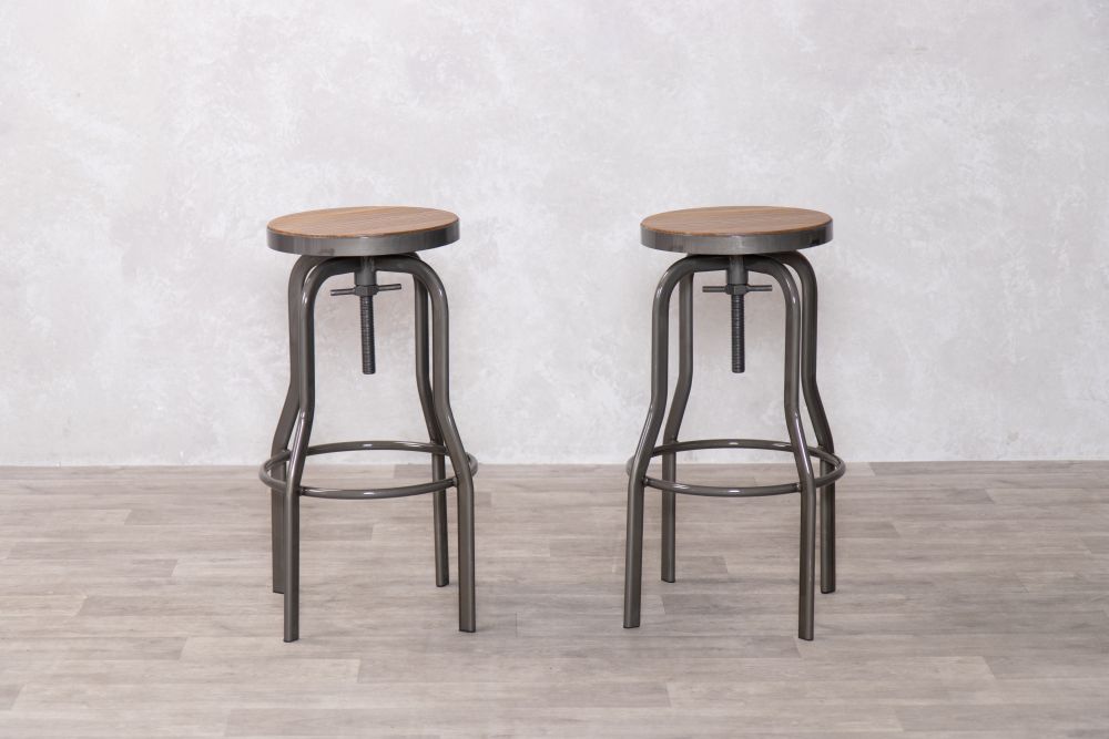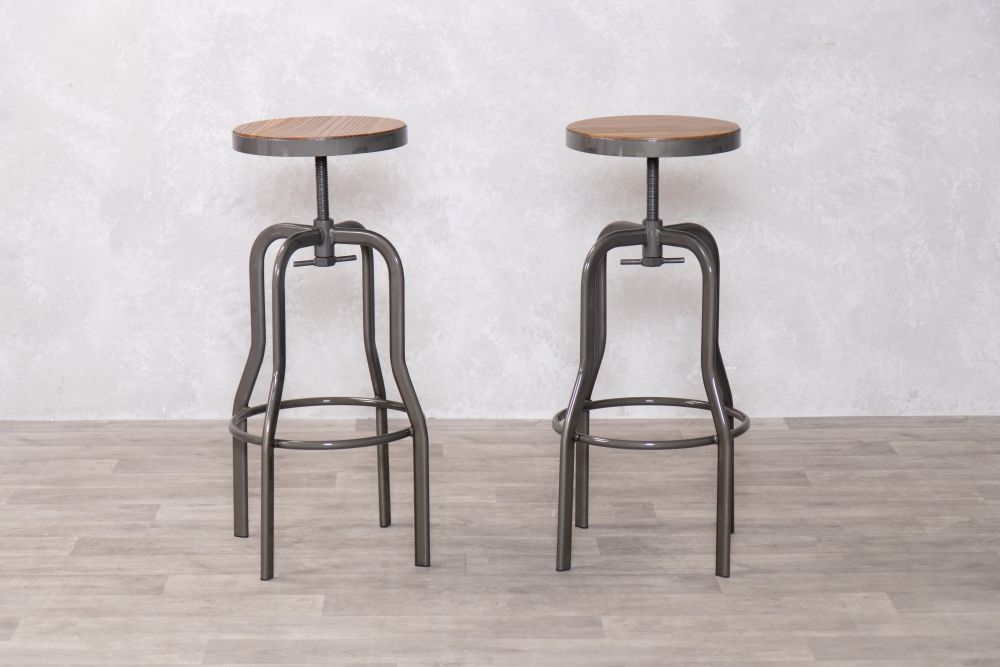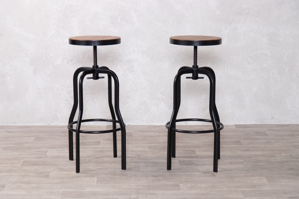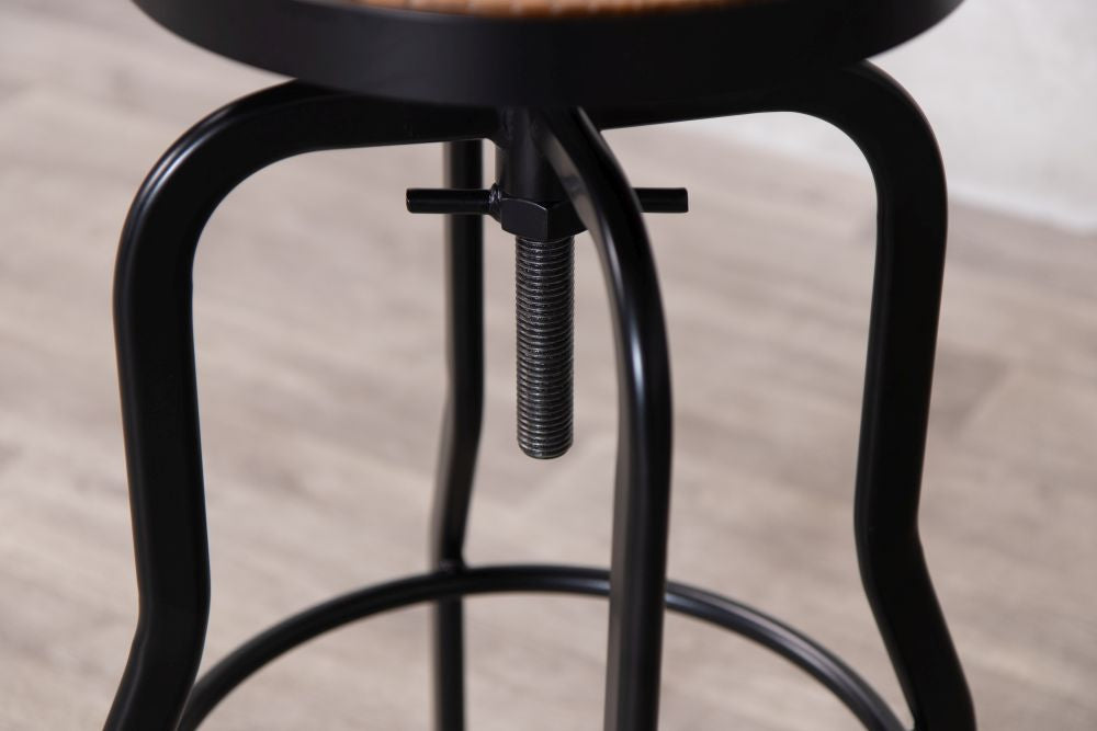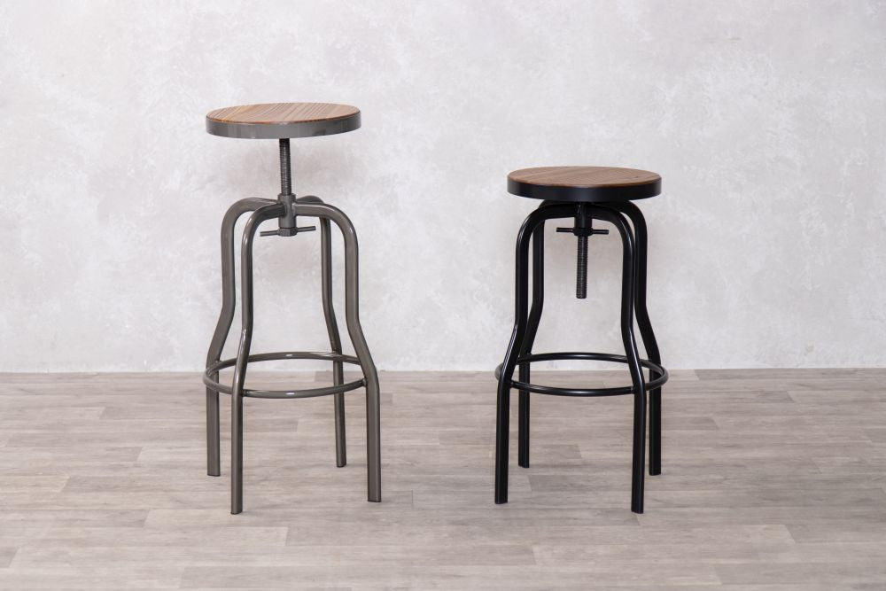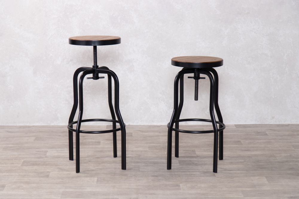 The industrial style screw thread allows the height of the stools to be adjusted, and when the desired position is reached, the seat can be locked into place.