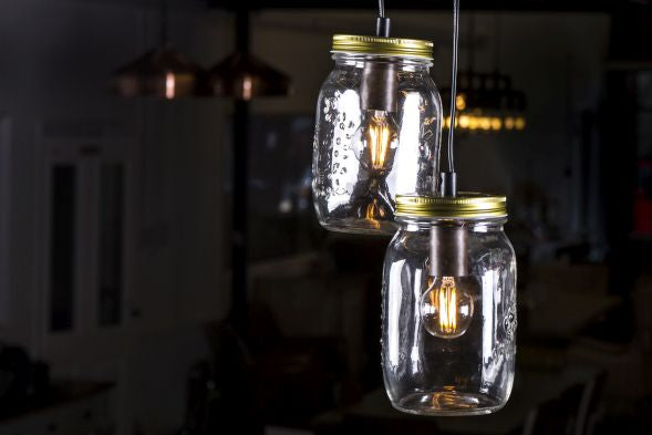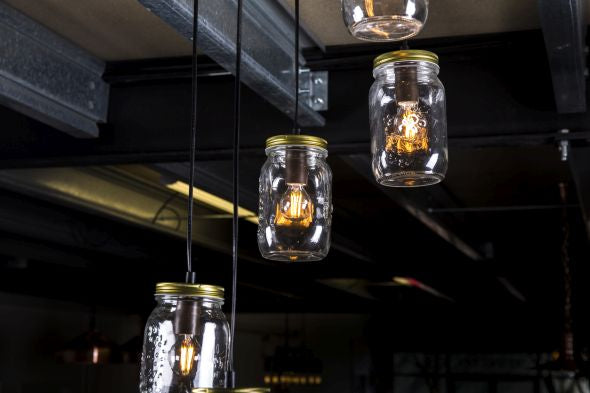 Bold and beautiful, our Five Bulb Mason Jar Pendant Light certainly makes a statement. The five clear glass mason jars are suspended from a wooden ceiling rose in a tiered spiral design. A fabulous feature for a vintage or retro style kitchen or hallway.