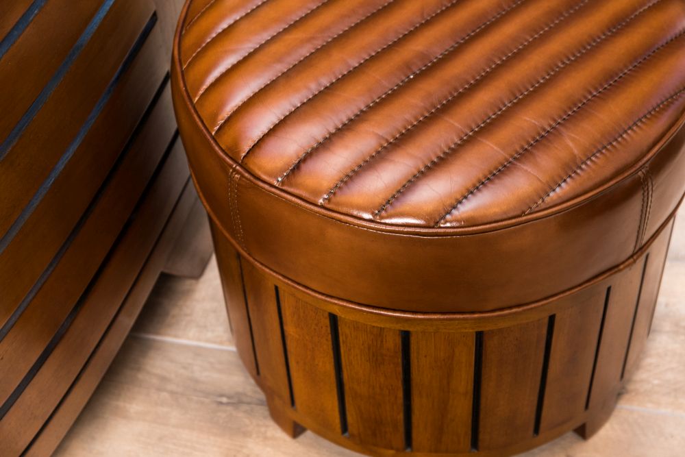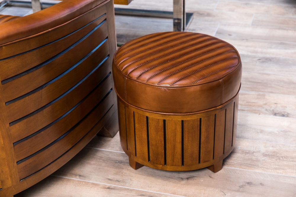 The sleek, round polished walnut hardwood frame and full leather top create the Medusa Leather Pouf, a glamorous representation of the 1930's marine lifestyle.