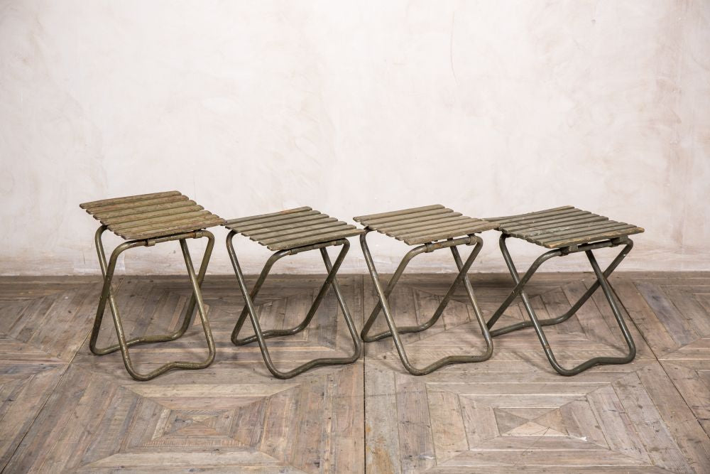 Each metal folding stool features a metal base, and either a metal or wooden slatted seat. The stools are coordinating; however, each stool varies slightly in colour and size.