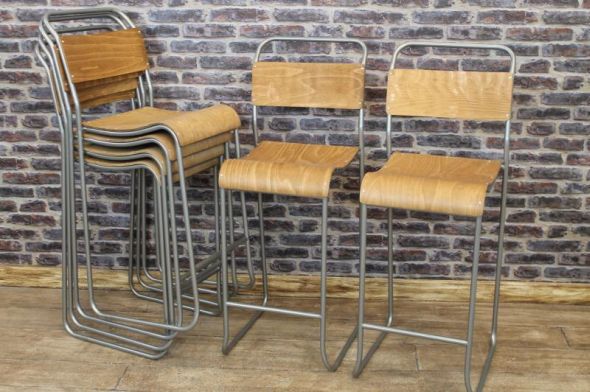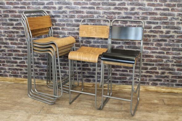 These vintage style 'Chelsea' metal stacking chairs/bar stools are a truly fantastic addition to our large range of vintage and industrial style furniture. Our vintage style steel ‘Chelsea’ stacking chairs by Peppermill Antiques come in a range of different frame and seat colours. They have quality aged plywood seats, and distressed painted tubular construction giving an authentic vintage appearance. These tall stacking bar stools/chairs are lightly worn in places which adds to their vintage inspired appearance. The chairs have a classic vintage styling and have a multitude of uses; ideal for restaurants, pubs, bistros, clubs, cafes etc. As shown in the photographs, these metal stacking chairs easily stack away for convenience; ideal for those with limited space available. These tall bar stools are also available with black seats and backs (please see photos below for more details). We have large quantities of all colours of these 'Chelsea' stacking chairs available, and the VAT is included in the price. Please note – the price stated is for one chair. Recommended weight limit - 120 kilos.