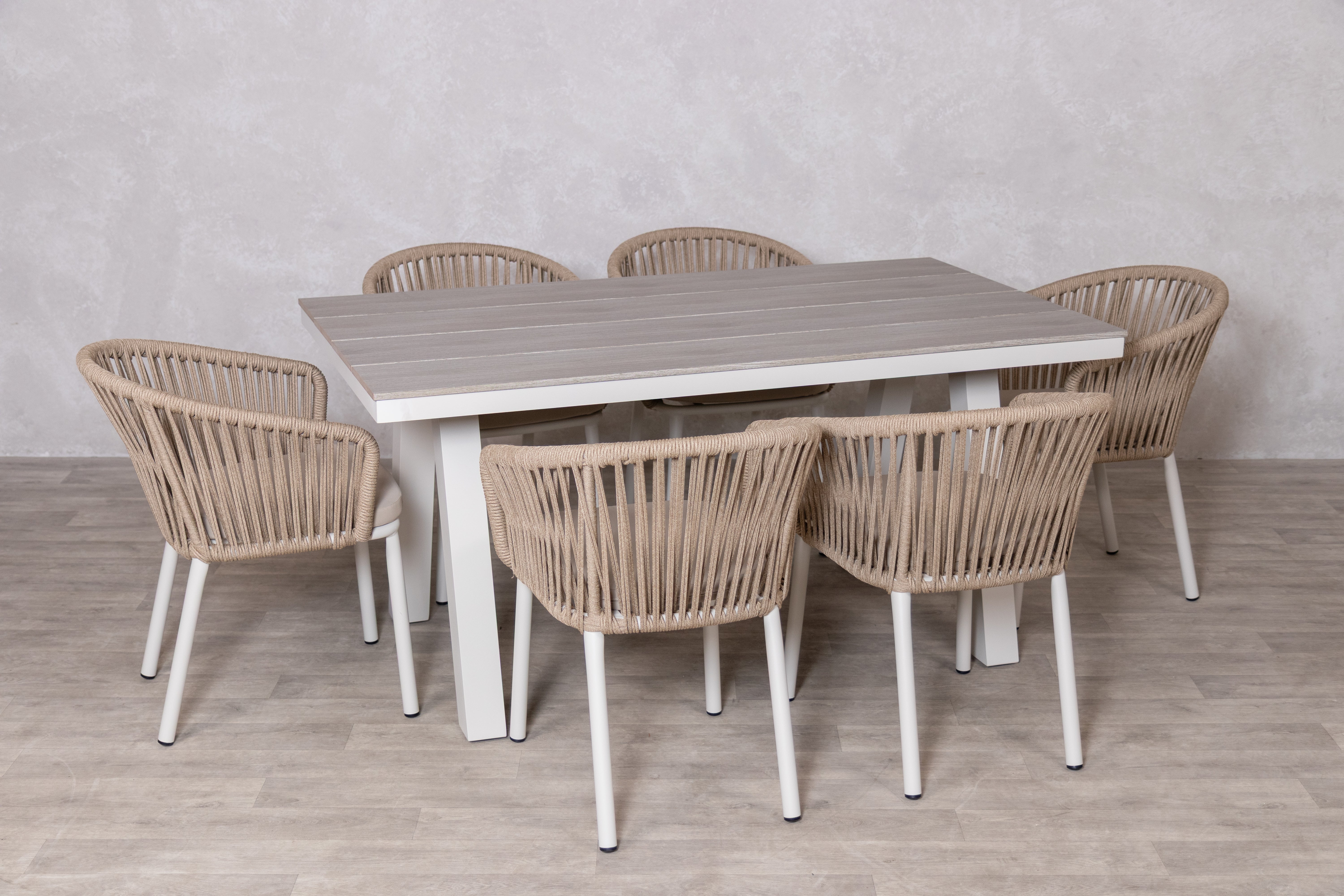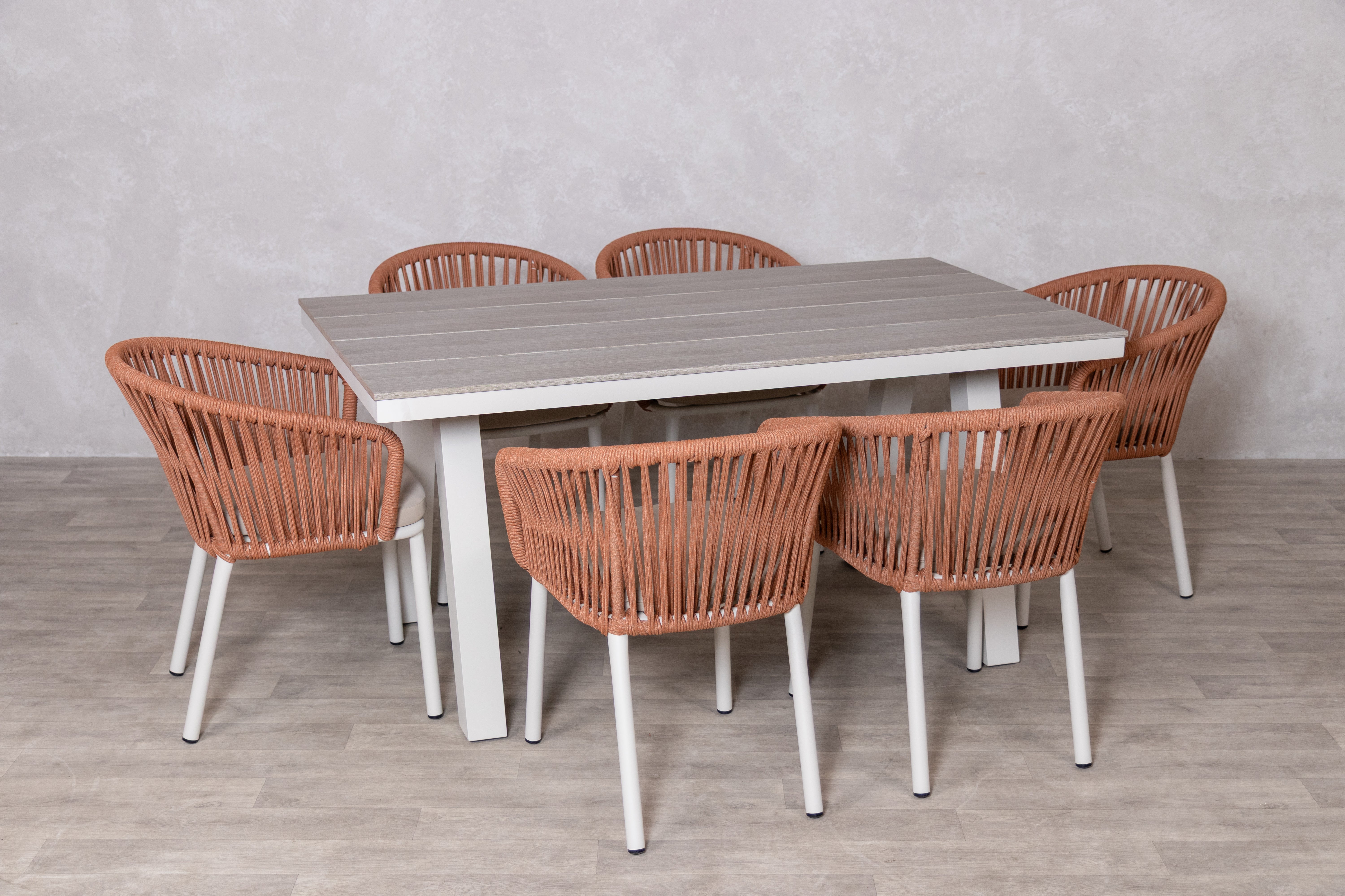 The Milano Outdoor Dining Set combines the 1.6m aluminium table with six matching Milano chairs, creating a complete solution for stylish outdoor entertaining. The table features a durable powder-coat aluminium frame and waterproof PS board top, while the six chairs showcase a curved, enveloping design with waterproof rope backrests and cushioned seating. Choose from three earthy rope colours, khaki, natural, or terracotta, all set against crisp cream aluminium frames. Built to last, both table and chairs are UV stabilised and feature large nylon foot protectors. Perfect for summer dinners or gatherings with friends and family for those long, warm summer evenings.
