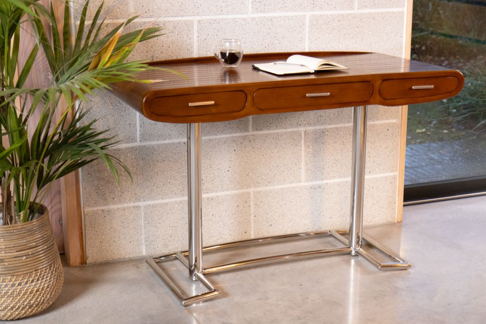 Invite 70's style into your home or commercial office with the sleek Monaco Desk. The slightly curved rubberwood and plywood top sits on an elegant stainless-steel base that gives each desk gives a light and airy appearance. Inspired by the shape of both contemporary speakers and television sets from the 70s, this desk is perfect for interiors searching for a retro edge. Featuring stainless-steel accents including pull handles and three spacious draws.