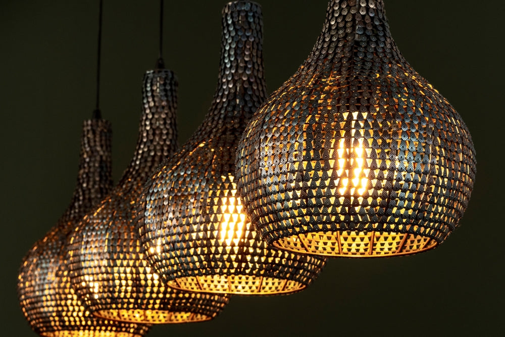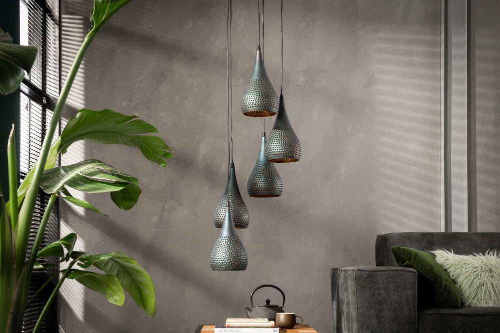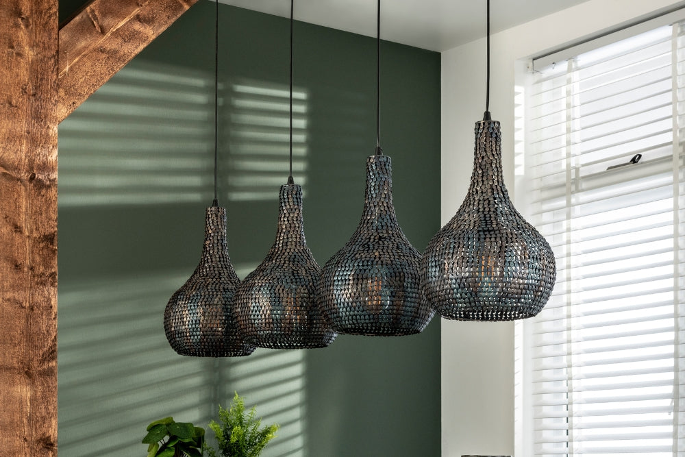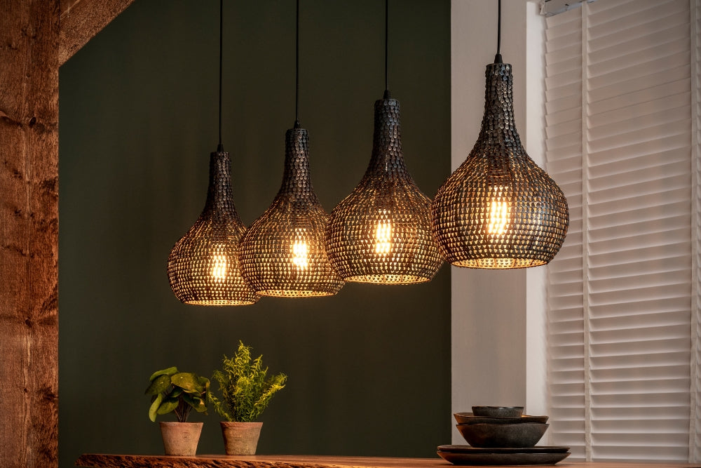 The Nova Pendant Light is available with either 4 or 5 strings. The 5-string version features mini perforated shades with a rich bronze interior that directs and reflects light beautifully throughout the room, with delicate perforations creating intricate shadow patterns on surrounding surfaces. The 4-string version showcases conical metal shades in a handmade burnished finish with elegant black and brown tones, where the semi-transparent nature of the shades diffuses light evenly across your space while maintaining ambient warmth. Both versions feature individually height-adjustable pendants (up to 150cm) on their suspension.