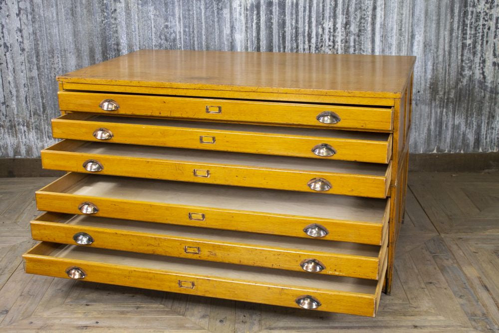 Made in the 1950s with a beautiful golden patina, this oak plan chest of drawers features lots of character and metal cup handles to add an industrial edge to the drawers. Individual card holders sit in the middle of the handles so you can easily label your drawers, a very handy trait if you want to keep your paperwork organised and tidy.