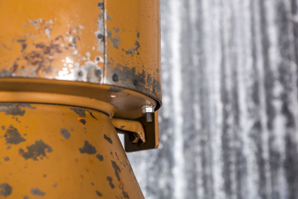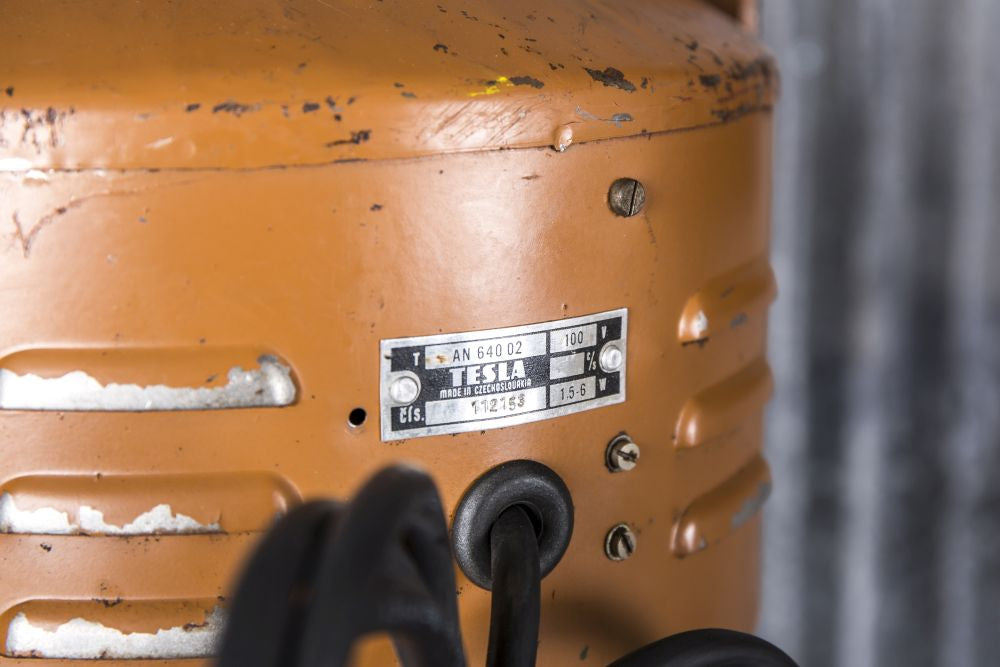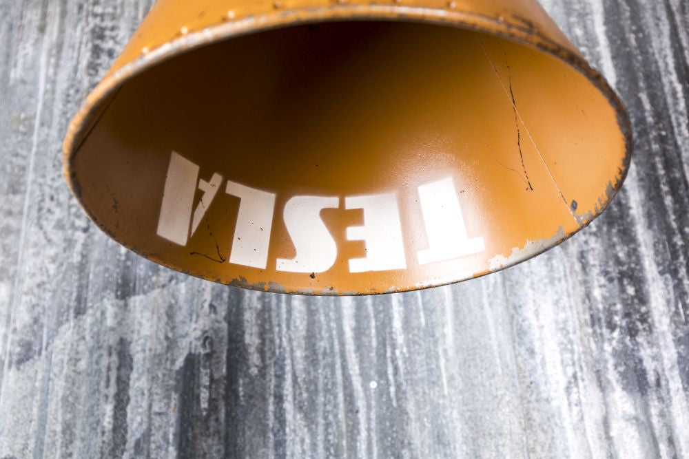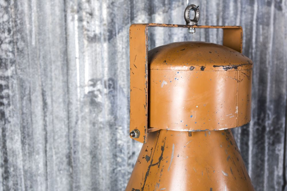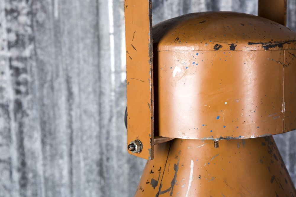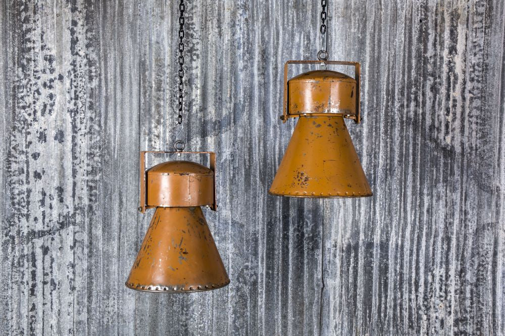 These lights were once Tesla loudspeakers, and have been repurposed to create ceiling lights. The lights are orange, but have become rusty and distressed over years of use.
