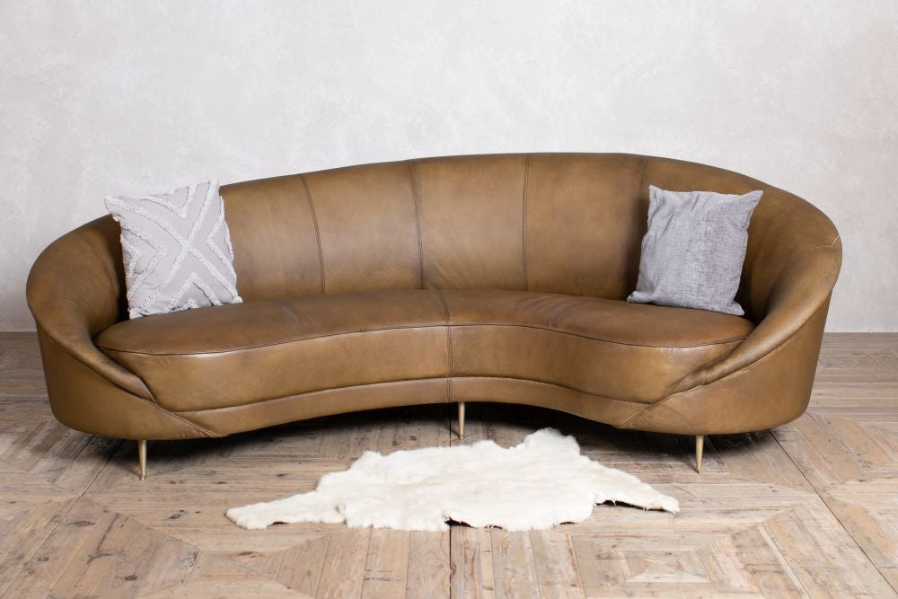 With a unique, curved, ‘kidney’ style shape, the Roxy sofa features real, full leather and aged brass feet, giving the sofa a mid-century style look. Upholstered in a luxe matt leather, this sofa is available in three different neutral colours, so you can choose the colour that fits in best with your interior. Equally perfect for any minimal, open modern living space, or vintage inspired office or large bedroom.