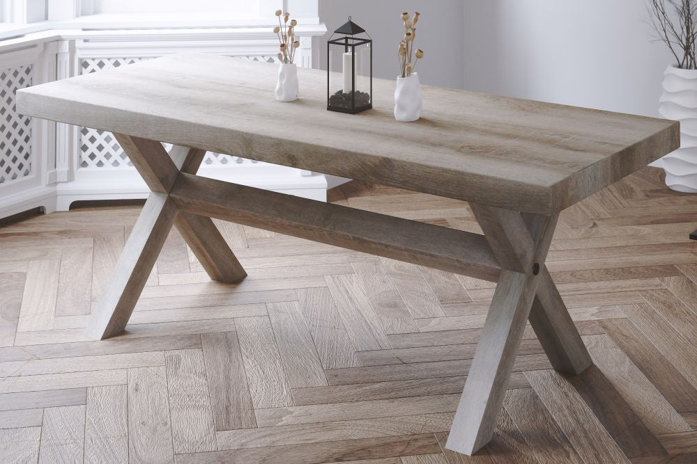 Entertain your guests on the Rutland Oak Effect X-Frame Dining Table. Featuring an oak effect top and x-shaped legs, the Rutland six seater dining table will fit into all kinds of different interior styles. As shown in the images, these high-impact wrapped table top has a simulated distressed wood effect, which contains scratches, knots, and bumps, giving the table a more authentic appearance.
