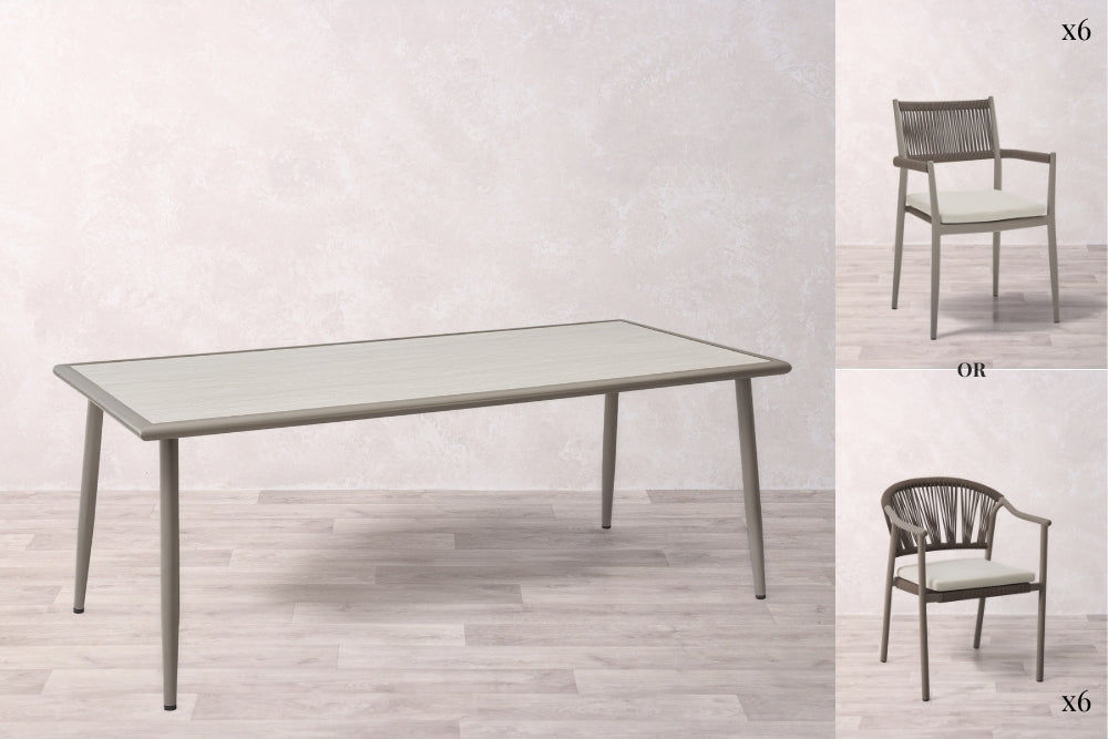 The Salerno 6 Seater Outdoor Table and Chairs Set transforms your outdoor space into an inviting dining destination, with the generous sintered stone table comfortably seating up to six people. The table's durable top resists stains and weathering while maintaining its refined appearance, supported by tapered metal legs that ensure stability. Complete the set with your choice of six garden chairs: the Belize rope garden chair features high-quality rope woven around a powder-coated steel frame, while the Sorrento garden chair showcases intricate rope construction around a sturdy steel frame.