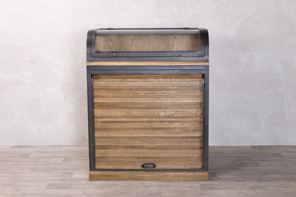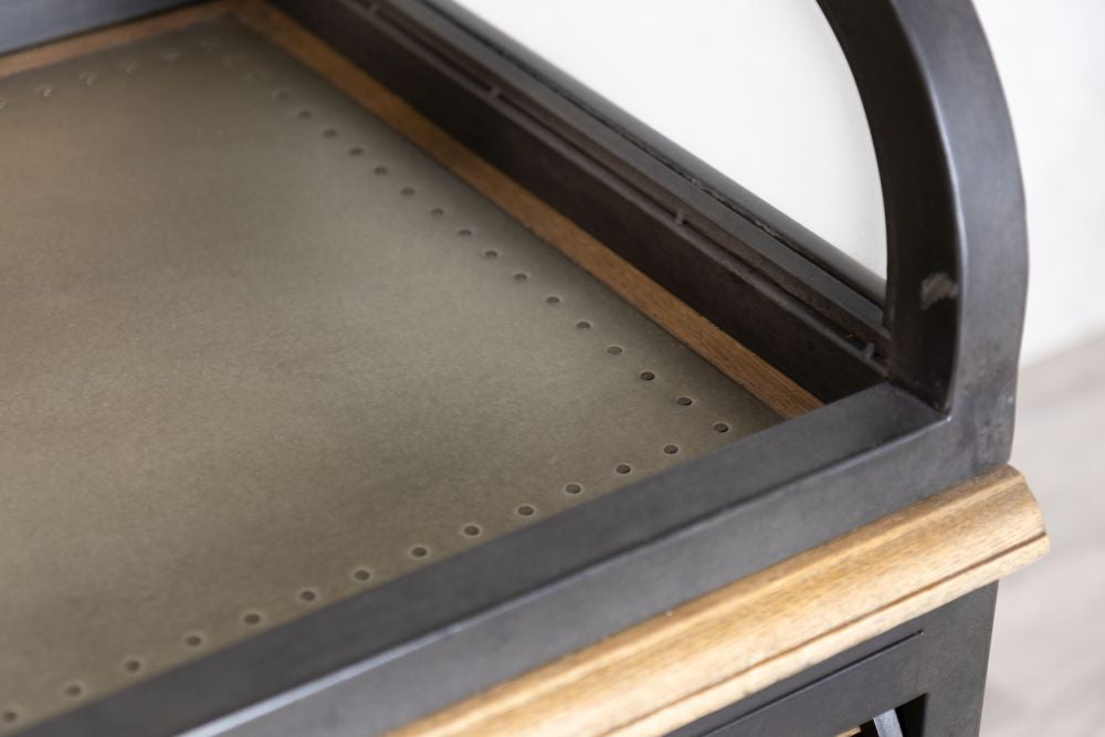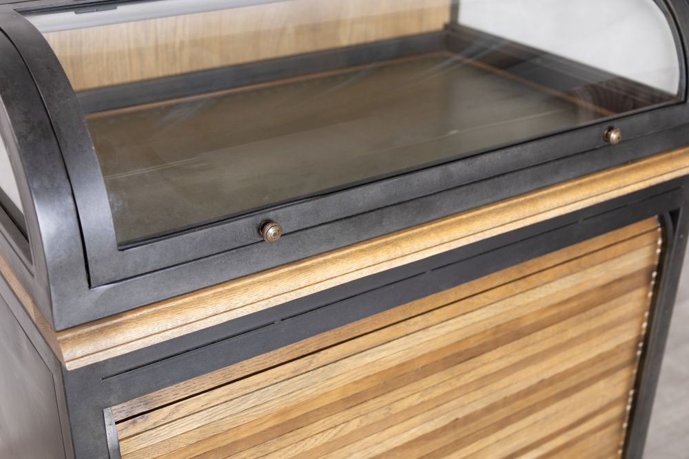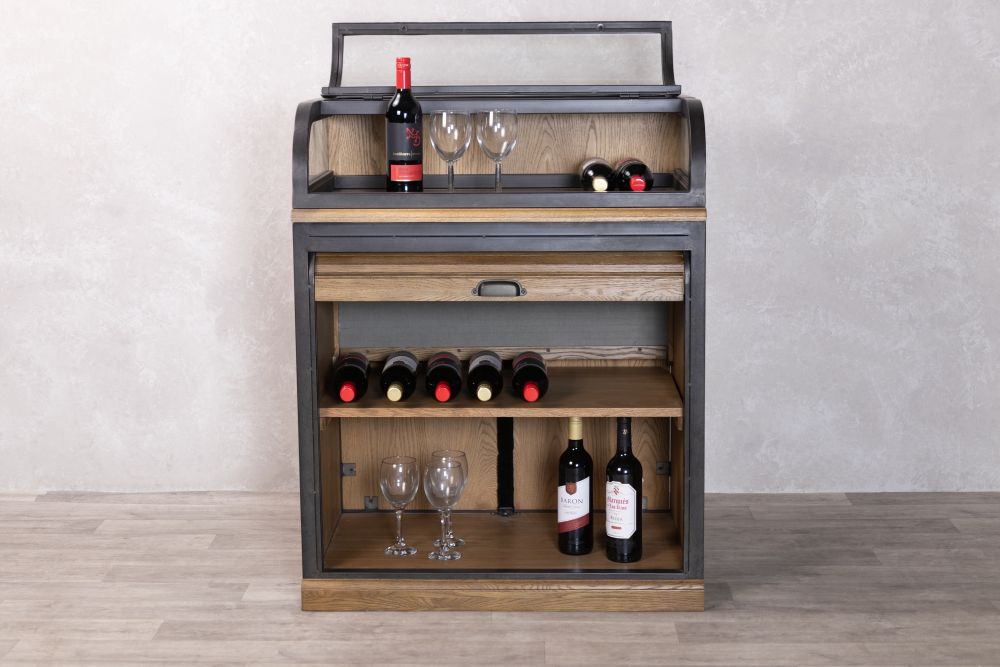 The Samuel Watch Collectors Wine Cabinet, with a tambour fronted door and lift up lid display top, this beautifully made cabinet has an industrial metal frame and a weathered oak finish, which will suit many stylish interiors and room settings. The cabinet is perfect for storing wine, you can even display your favourites on the glass topped shelf.