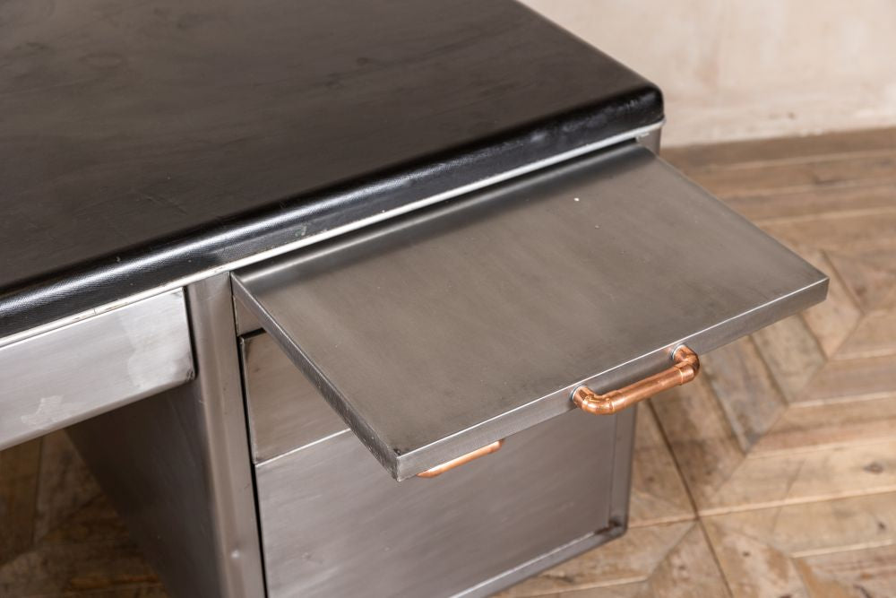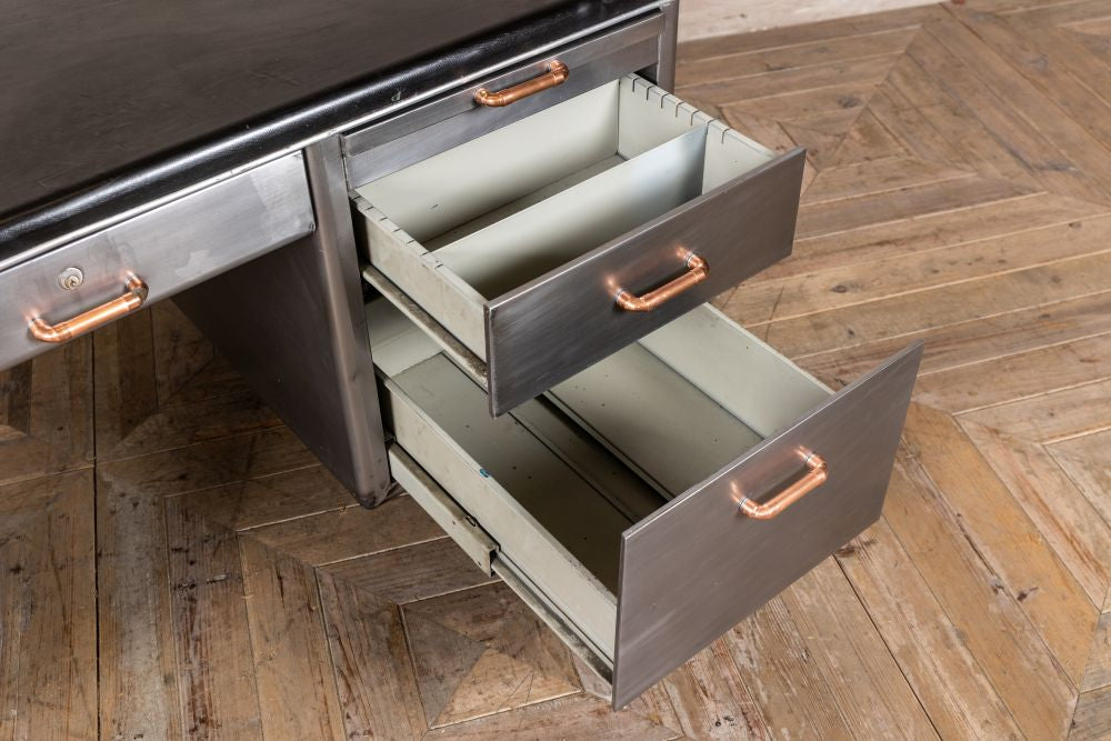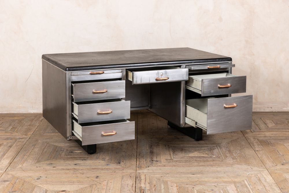Add industrial style to your space with this Stripped Metal Industrial Desk. With lots of desk space to the top and lots of drawers for storage, this office desk is perfect for a gentleman’s study in a home office or workplace.