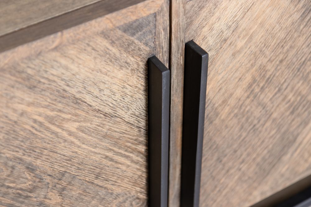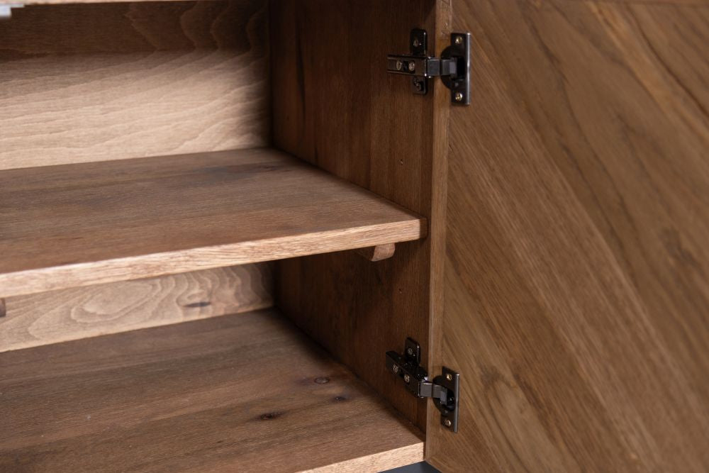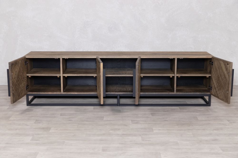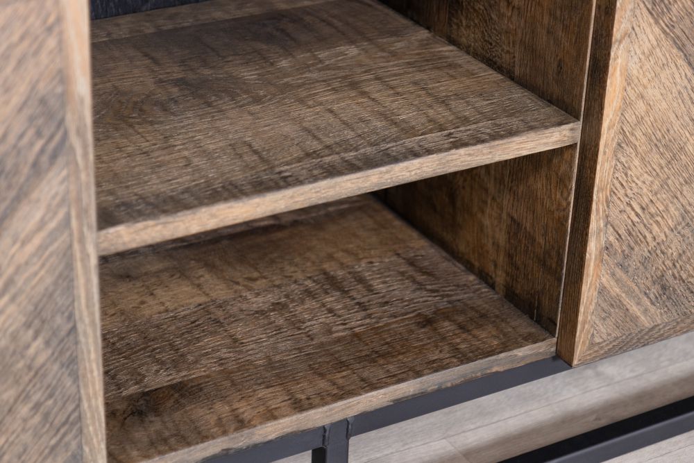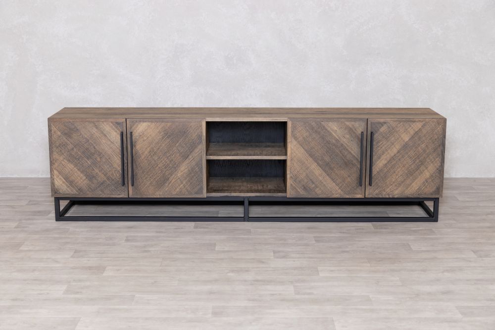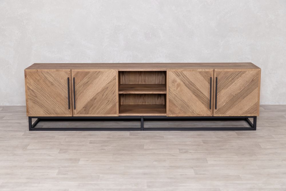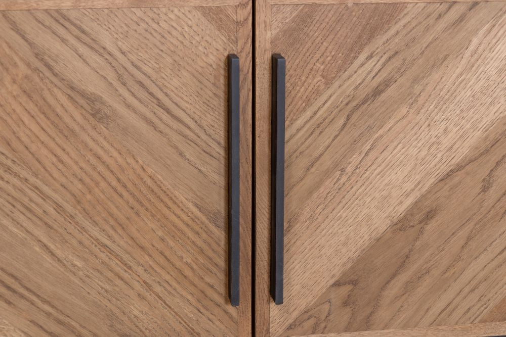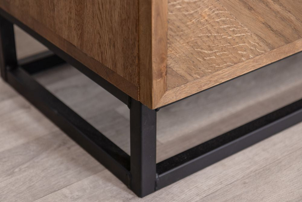 The black frame and handles bring an industrial edge to the Tiverton Oak TV Unit, which complements the chevron pattern to the front of the stand.