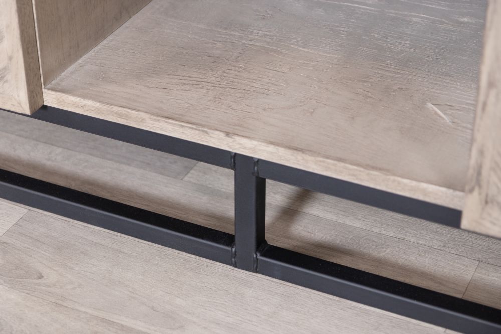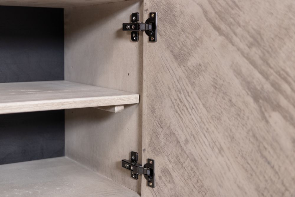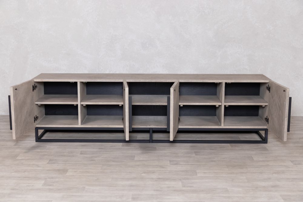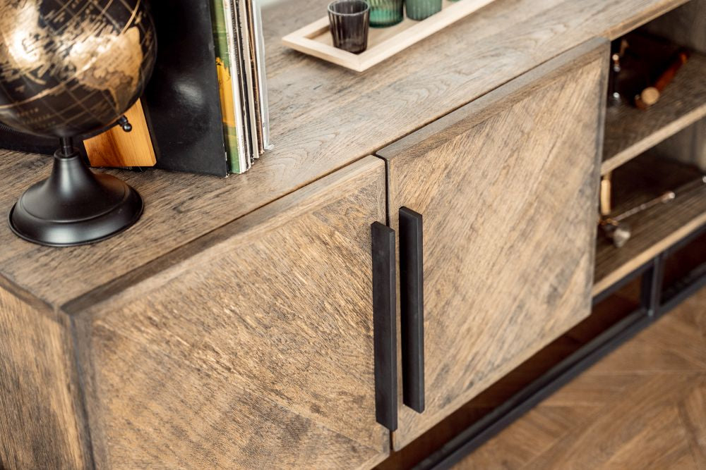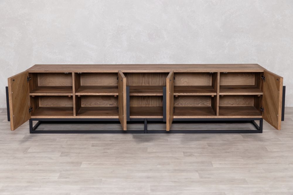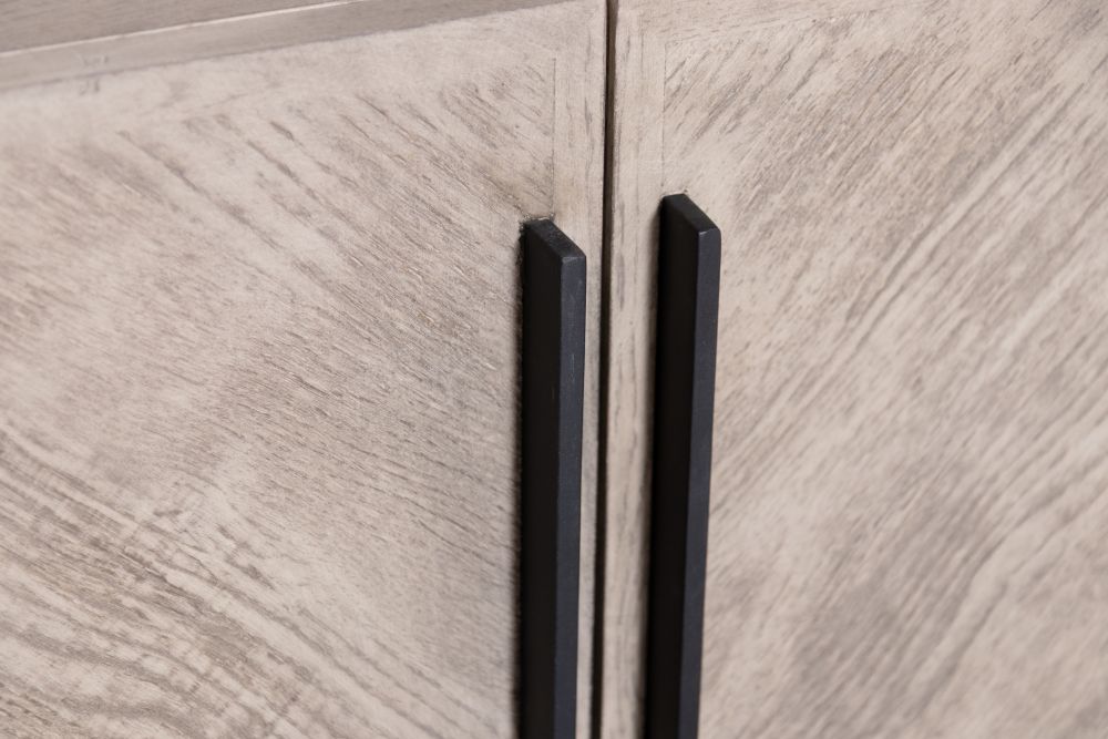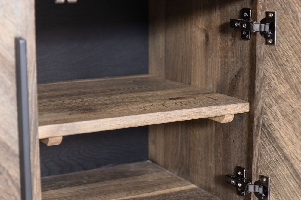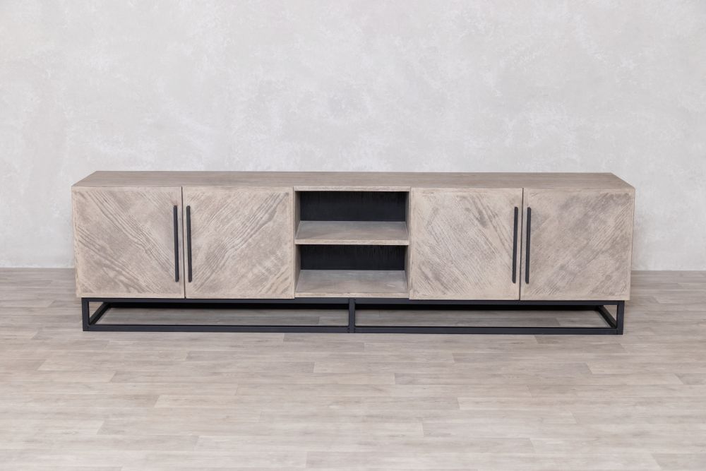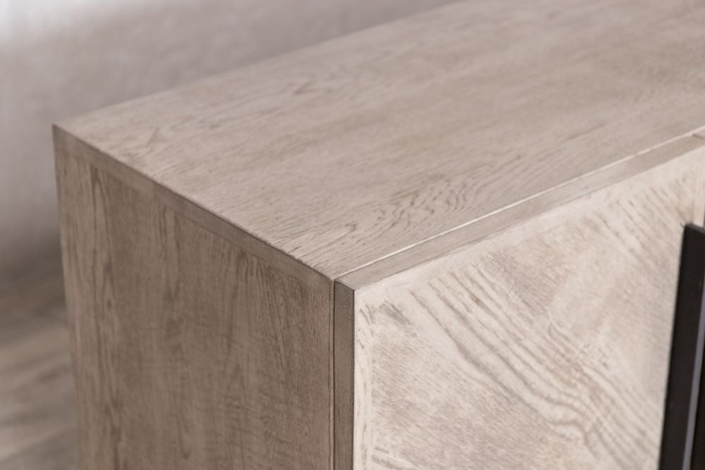 The black frame and handles bring an industrial edge to the Tiverton Oak TV Unit, which complements the chevron pattern to the front of the stand.