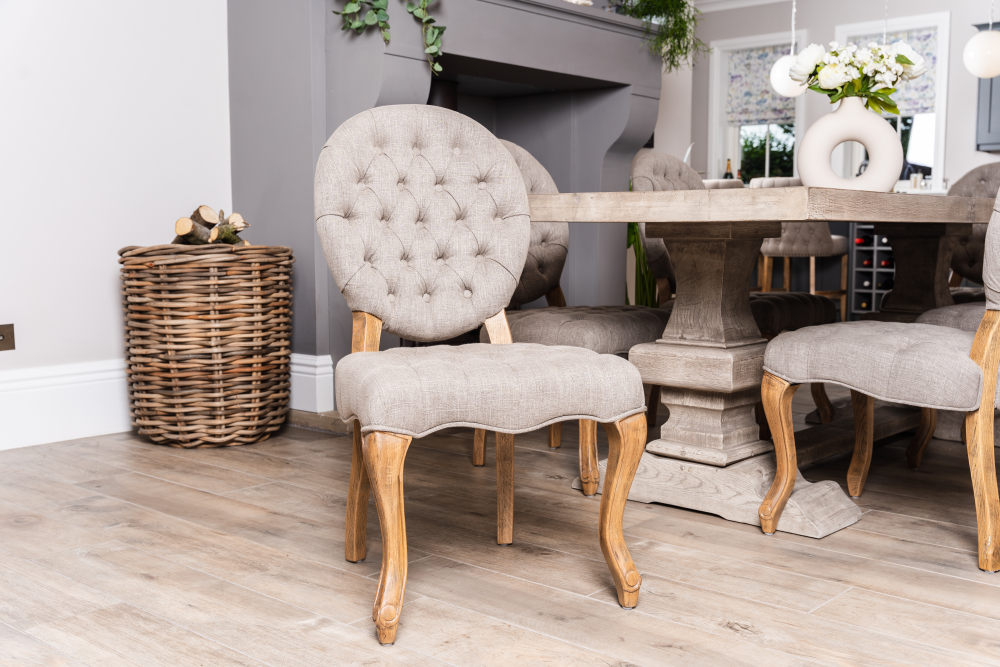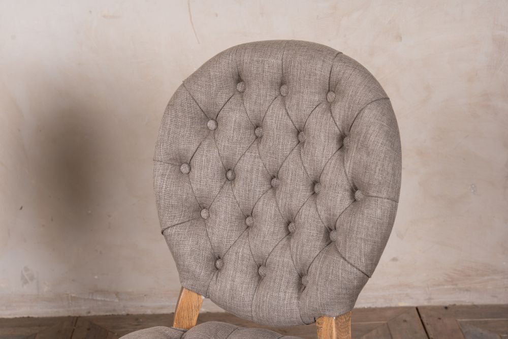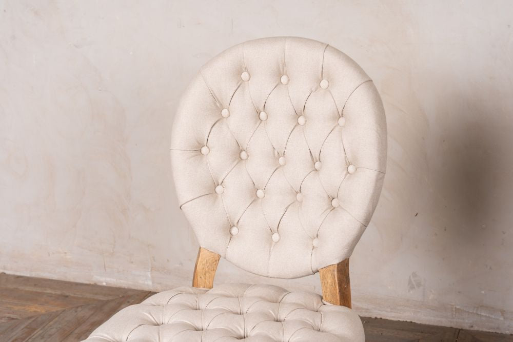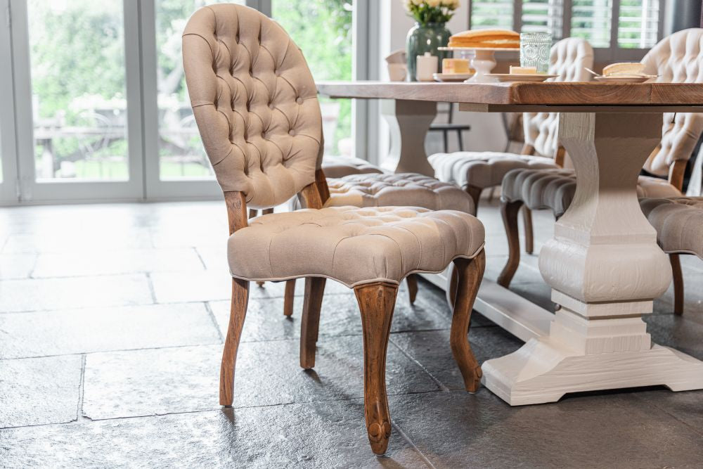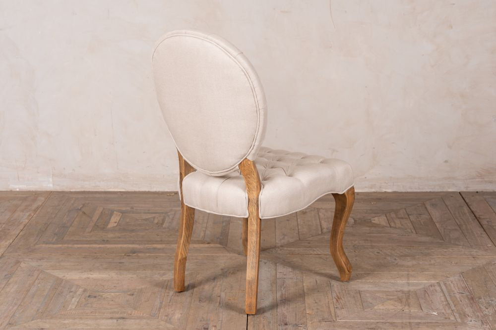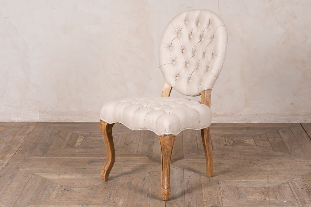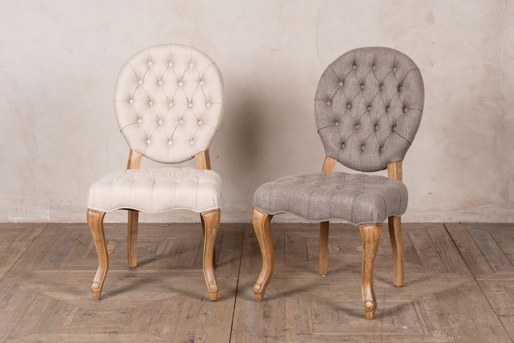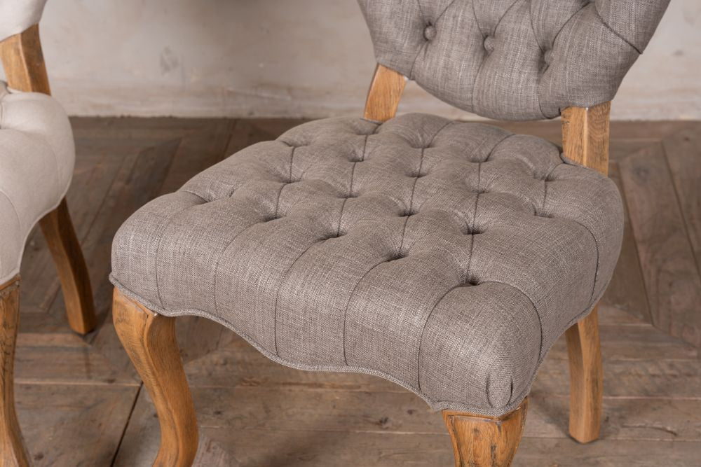This French style dining chair is based on an 18th Century Rococo style, with linen upholstery in both Almond and Stone and features elegant cabriole legs.