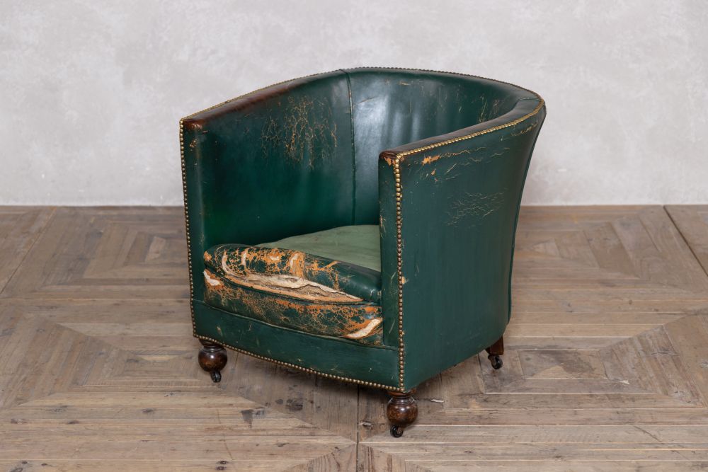 This Victorian tub chair showcases classic turquoise leather upholstery, with decorative studding along its curved edges and traditional turned wooden feet. While the patina shows authentic signs of age through its weathered leather and distressed detailing, this piece requires restoration work to return it to its former glory. Despite its current condition, this genuine piece of Victorian craftsmanship exhibits the character and charm of its period, waiting to be revitalised to its original splendour. The turquoise leather, though worn, speaks to the bold colour choices of Victorian furniture makers who weren't afraid to make a statement.