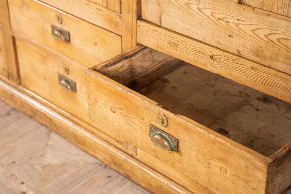 Three original four-panel doors lead down to 6 drawers of varying sizes, which could be used to store cutlery, placemats, and table linens.
