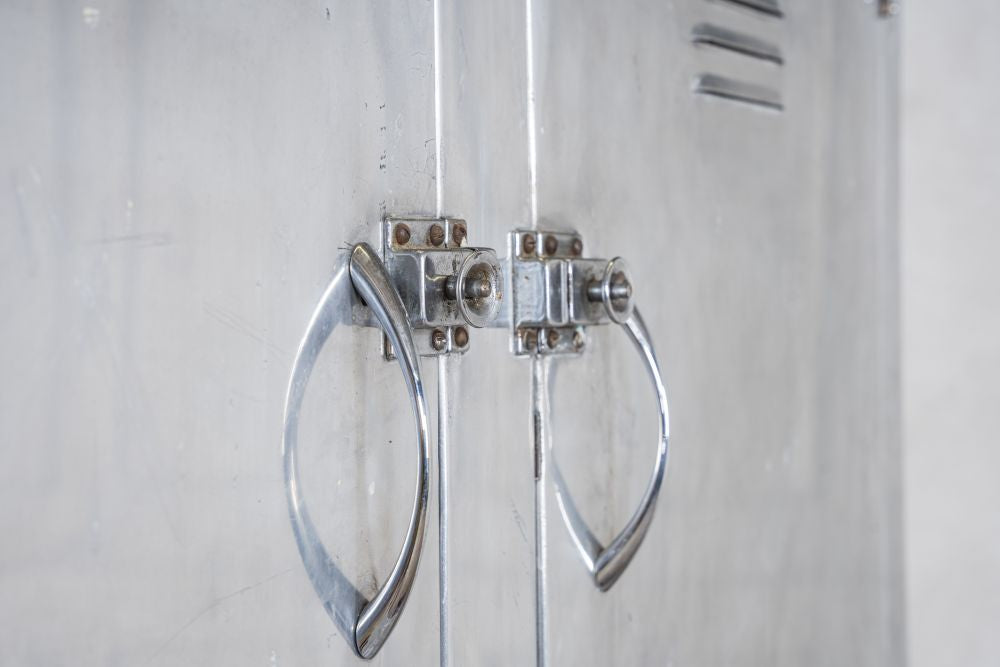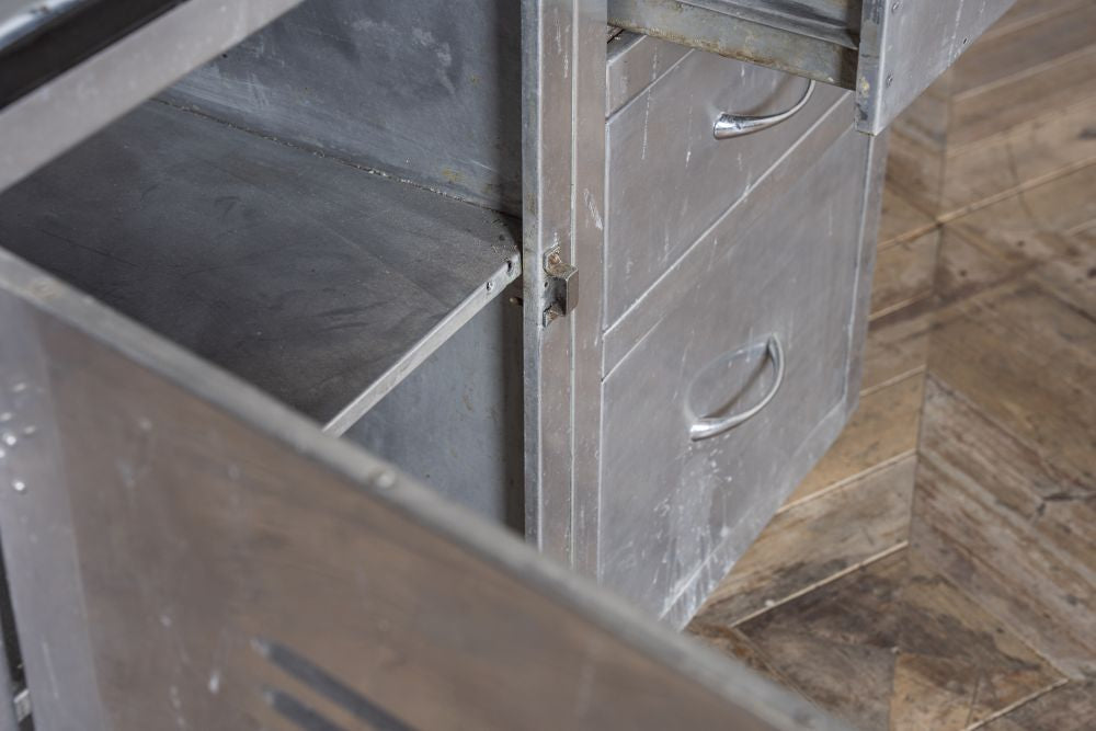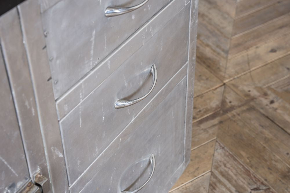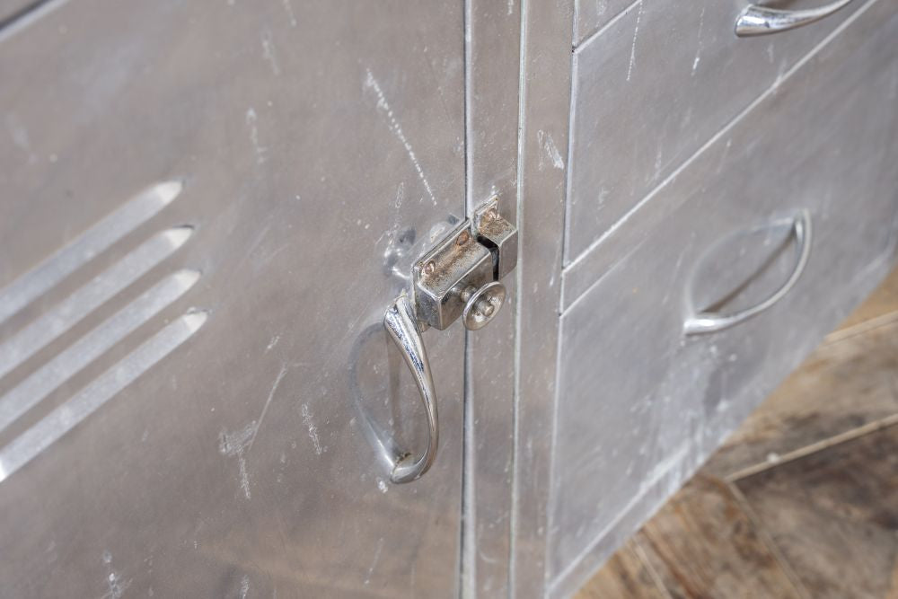 This Vintage Aluminium Waiter Station is a unique and eye-catching piece that would make a great addition to any commercial space or restaurant. The industrial style design is both functional and stylish, providing ample storage space with its three cupboards and three drawers, including one larger drawer for additional storage.