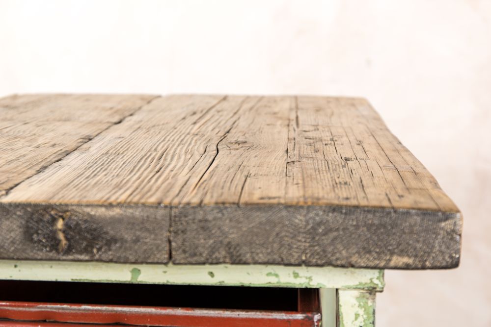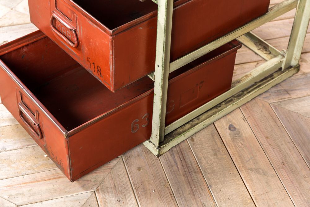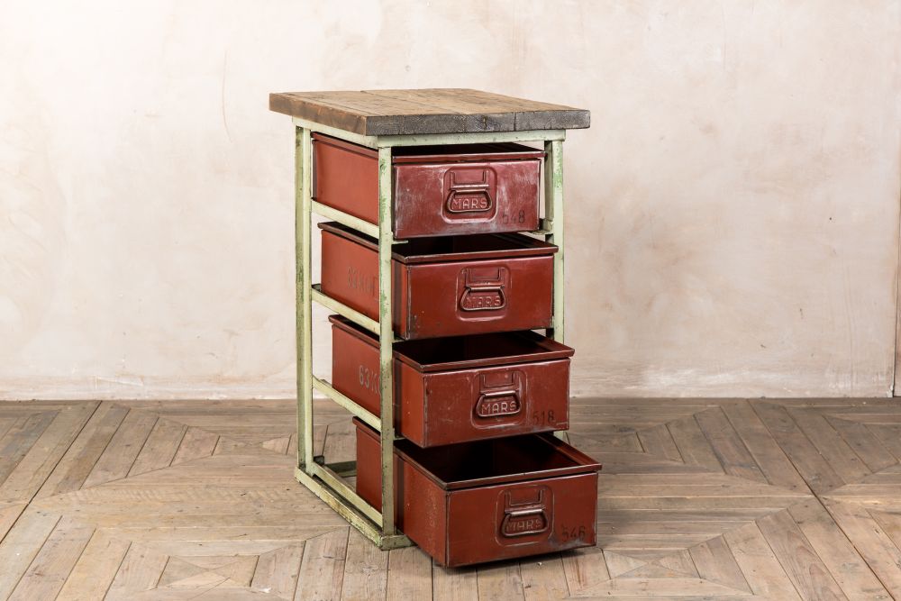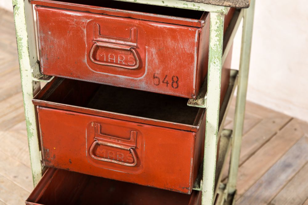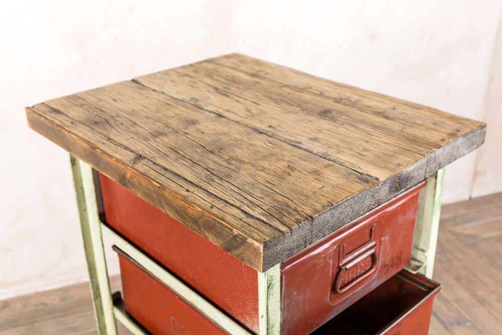 The unit has a metal frame, red metal drawers and a wooden worktop. The cabinet has seen plenty of use in its lifetime and has acquired a distressed finish that makes it ideally suited to an industrial style interior.