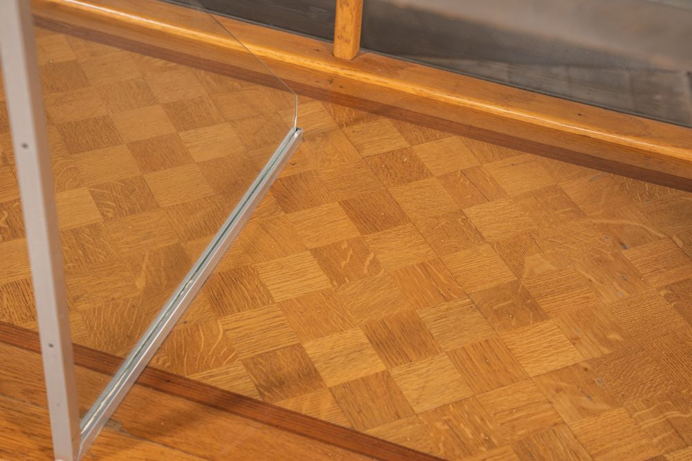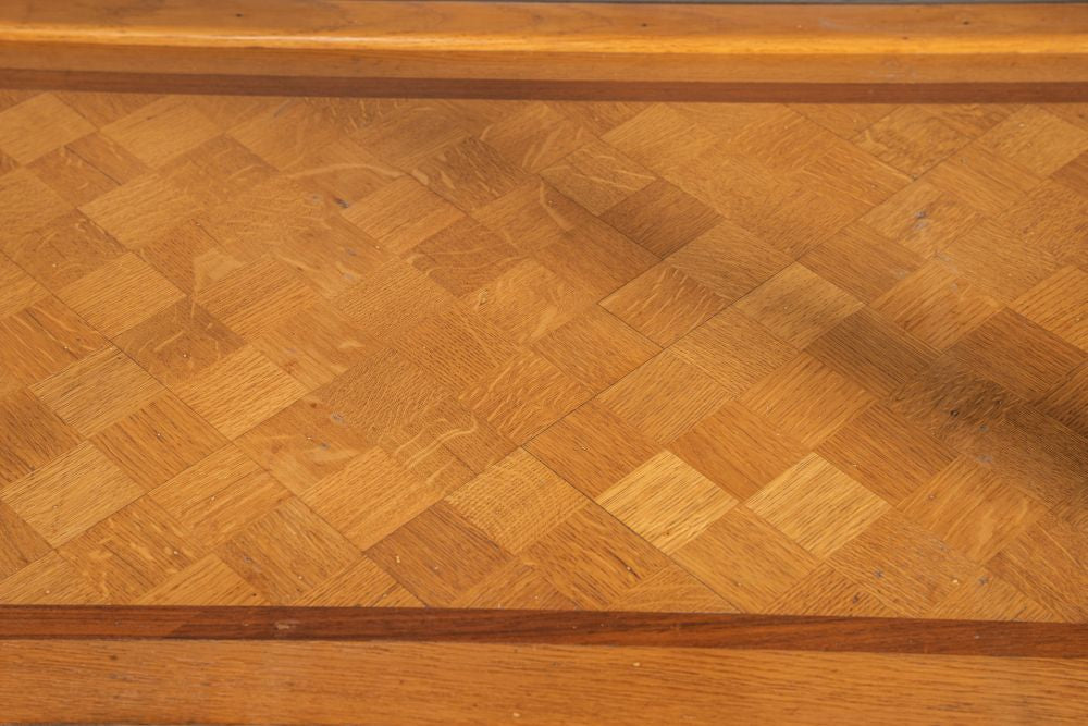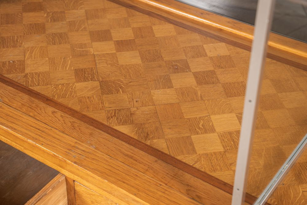 Robust wooden legs, bold geometric lines and the parquet display base are nods to the iconic Art Deco style. Originally crafted to be subtly sophisticated, this shop counter has transformed over the years into a prominent piece, worthy of admiration.