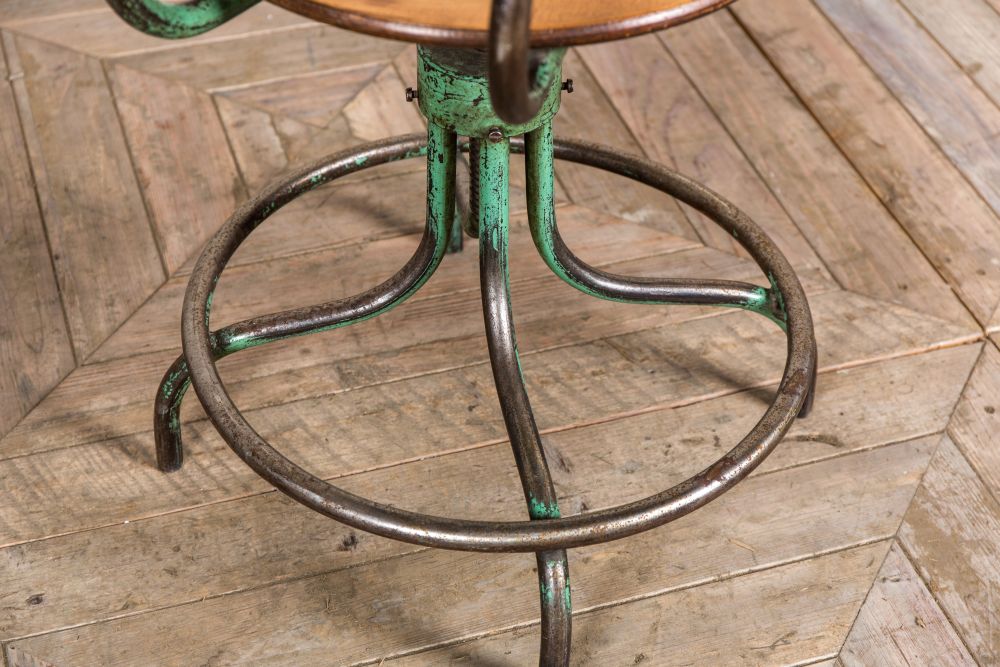 The stools have a plywood seat and back. The frames have a distressed finish, with remnants of green paint. The stools would be a great addition to a vintage or industrial style interior.