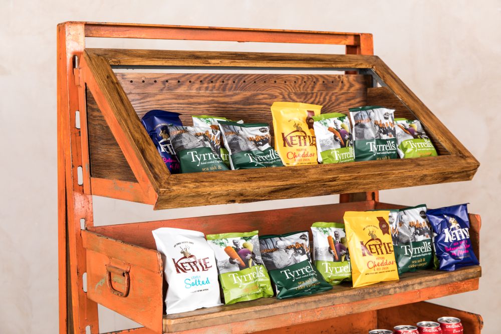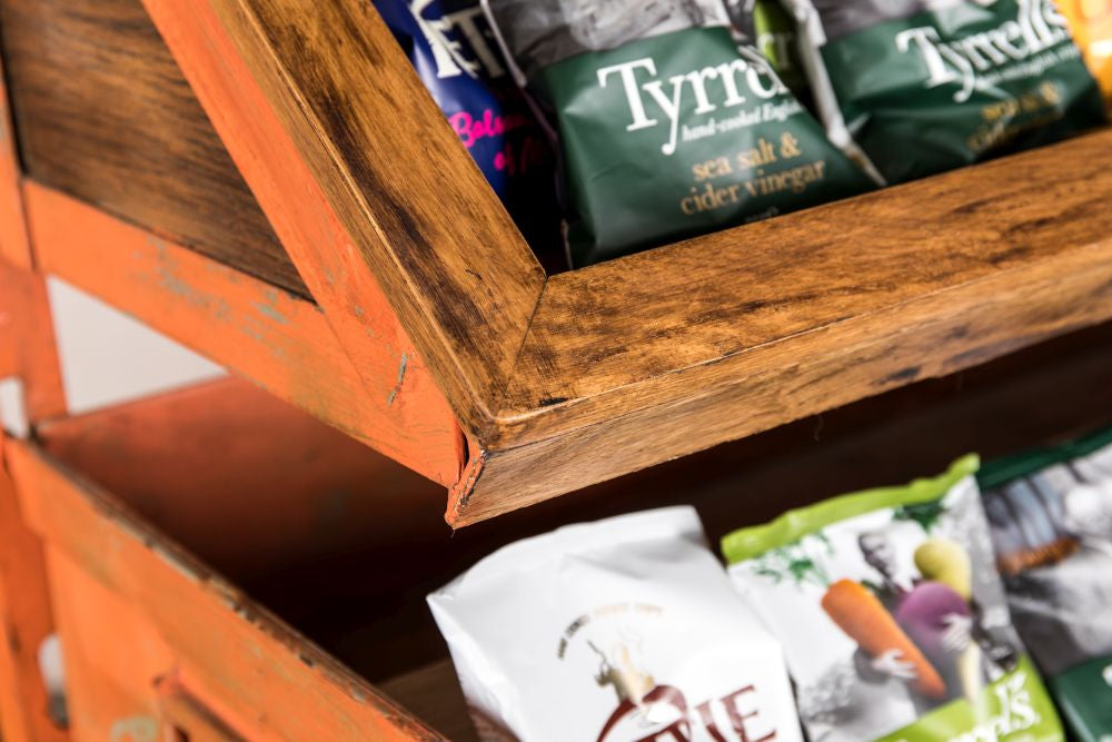 Fill this wonderful Vintage Industrial Shop Display Stand with the tastiest treats you can find! A great impulse buy stand for retail shops, there is plenty of shelving space to display many different impulse buys. Stack different flavoured cans of pop on the shelves or fill it with delicious cheddar and balsamic vinegar crisps – you could even display shoes, jewellery or clothing on these shelves which would look really effective in a vintage shop or urban style department store.
