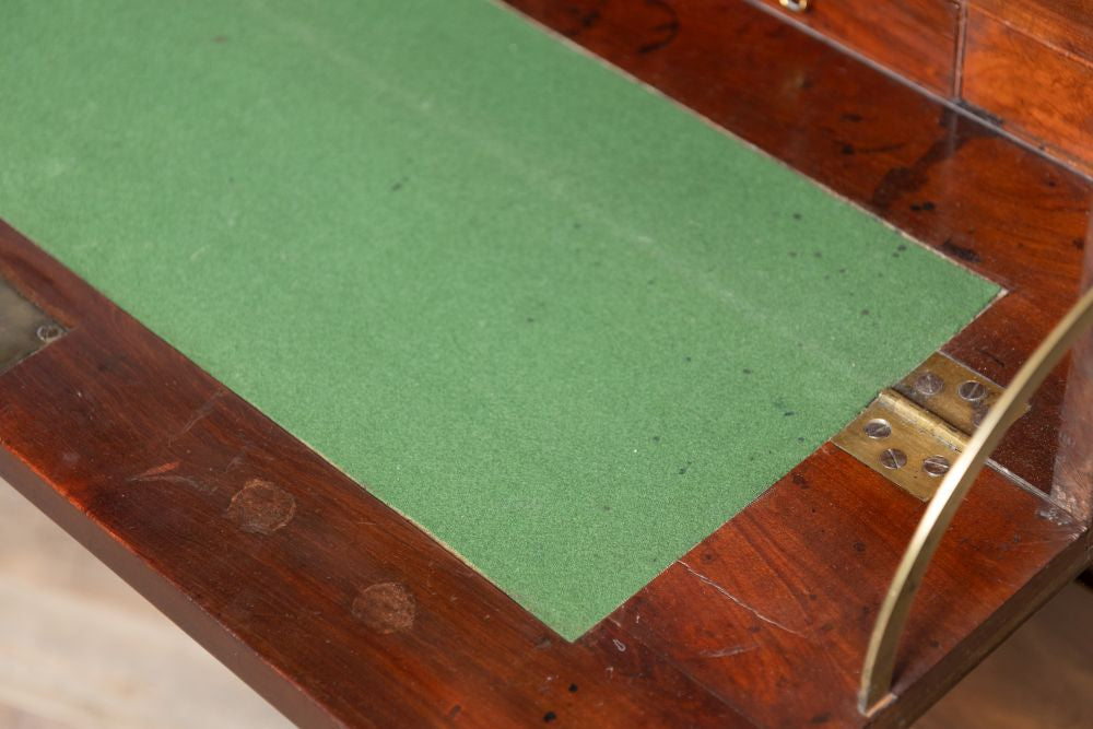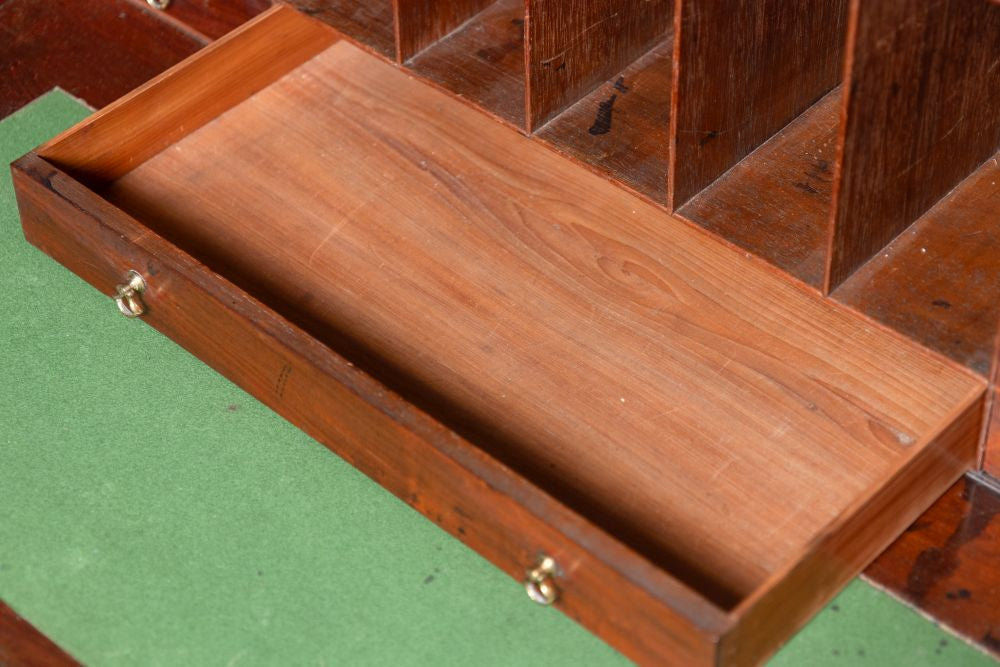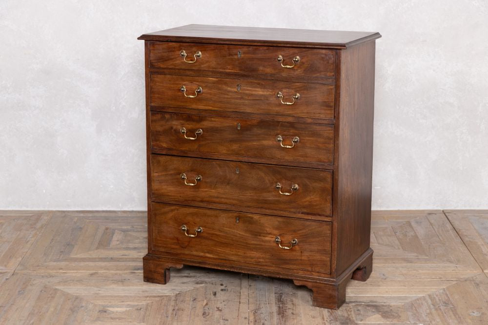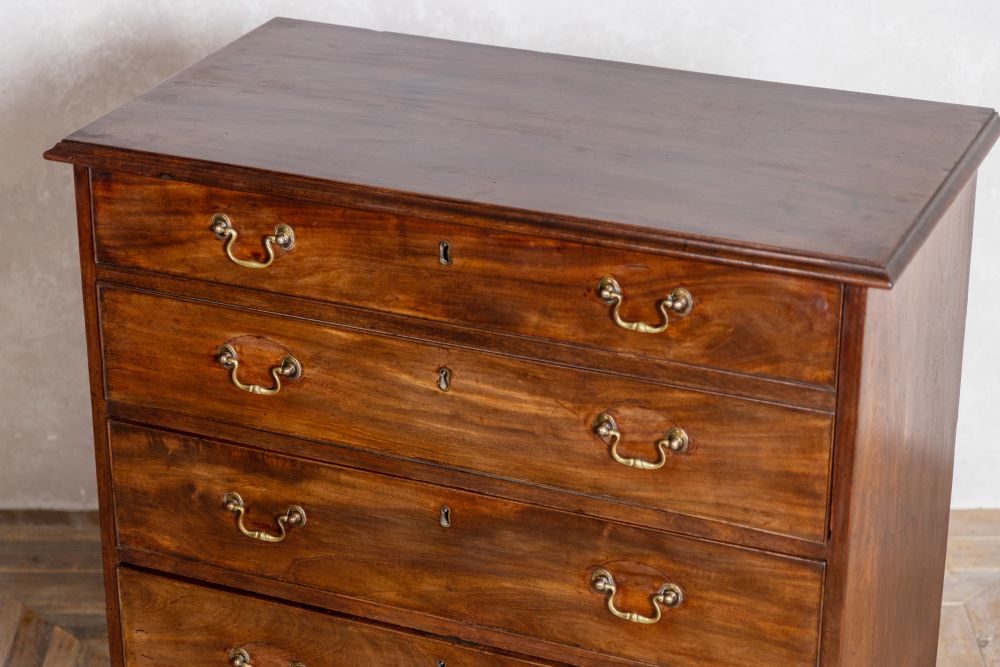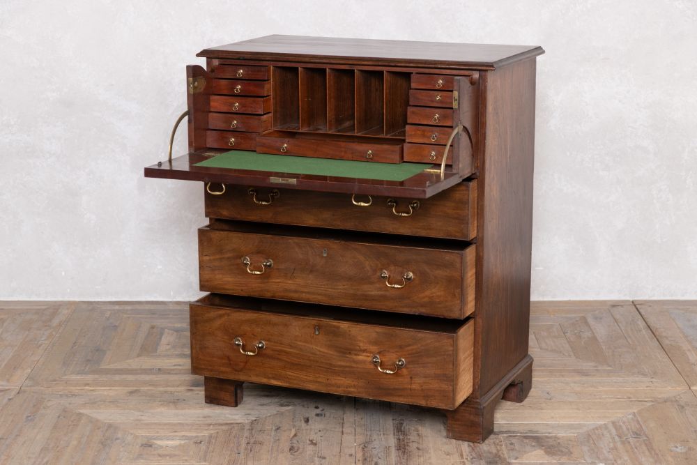 This George III secretaire chest in mahogany is a rare find for those seeking compact antique furniture with character. The piece is remarkably narrow and small in scale, making it perfect for tighter spaces without sacrificing authenticity. It features oak-lined drawers and retains its original locks, while the handles were replaced in the early part of the 20th century, keeping with the overall aesthetic of the chest. Recently sourced from a beautiful Cotswolds home, this secretaire chest is in outstanding condition and ready to bring Georgian craftsmanship into your home.