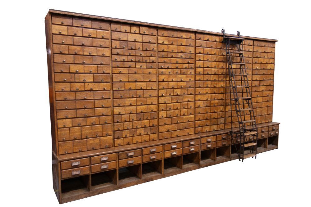 Originally stationed in a 1924’s German railway station, the Vintage Shop Haberdashery Cabinet with Rolling Ladder will elevate your quirky shop front or restaurant! This exceptional find embodies high-quality craftmanship, featuring original handles and a solid oak construction that speaks to its durability and enduring charm.