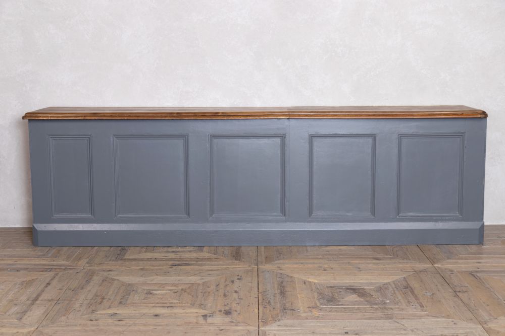 Add a touch of timeless elegance to your kitchen or commercial space with the exquisite Vintage Haberdashery Shop Counter, a rare find originating from the 19th century. This captivating piece boasts a distinguished appearance with its grey panelled finish that exudes old-world charm.