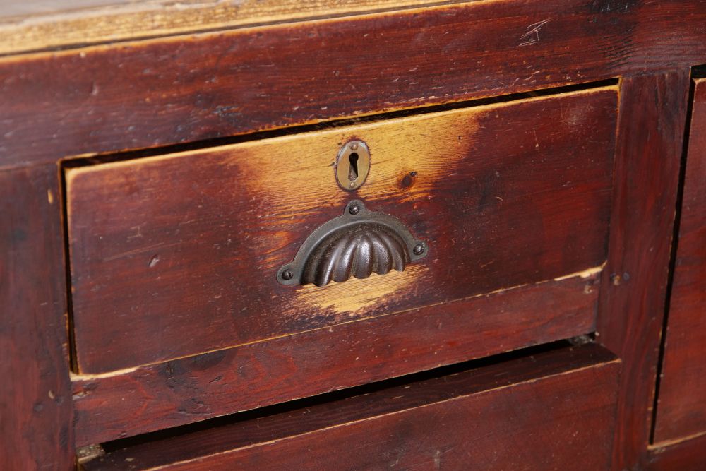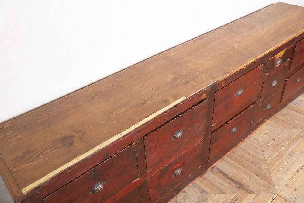 Featuring original handles and multiple drawers, this counter is not only a stunning focal point but also offers practical storage for a variety of items, making it ideal for organising kitchen essentials or displaying merchandise in retail setting. The inclusion of the brass yard measurer and pine top also adds a nostalgic flare.