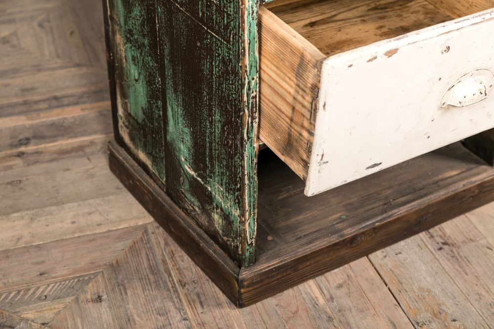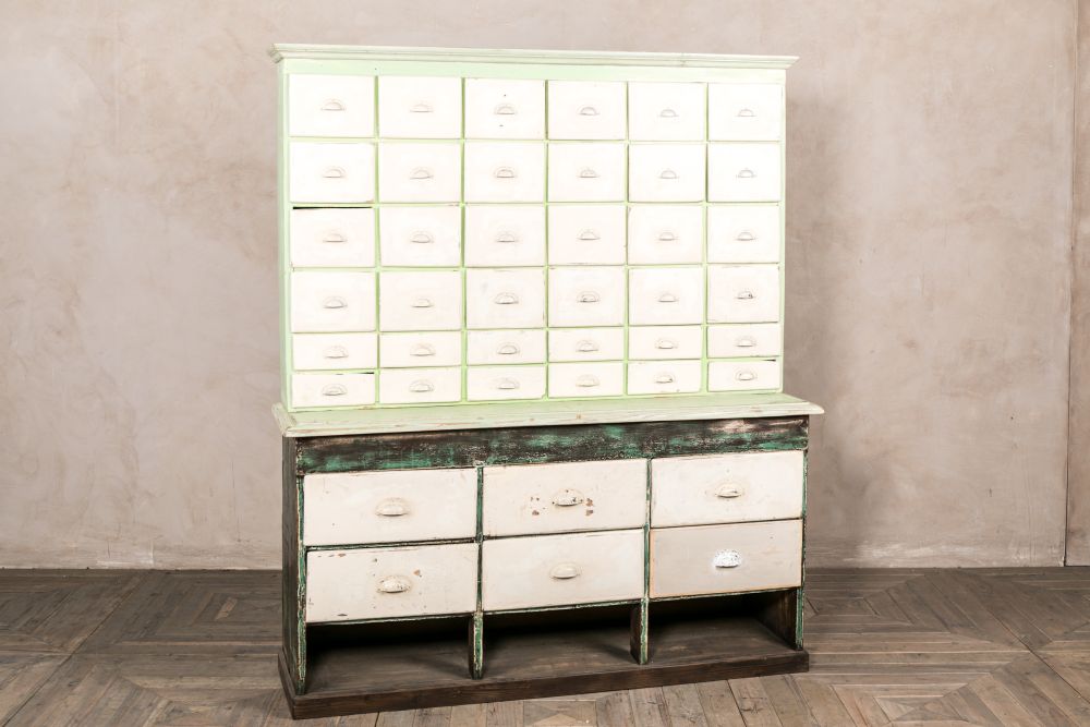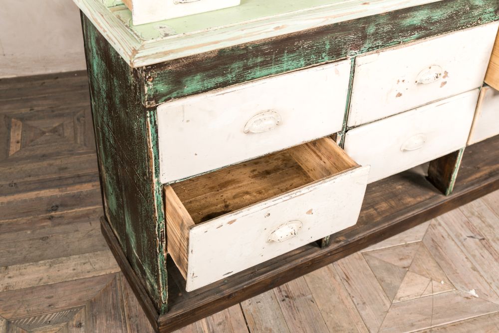 The cabinet features multiple drawers; the drawers are painted white whilst the frame is mostly painted green. The paintwork on the cabinet has become distressed over the years, which we feel adds character to the item.