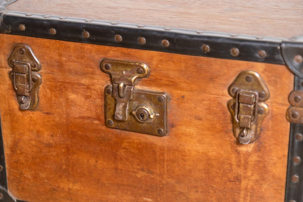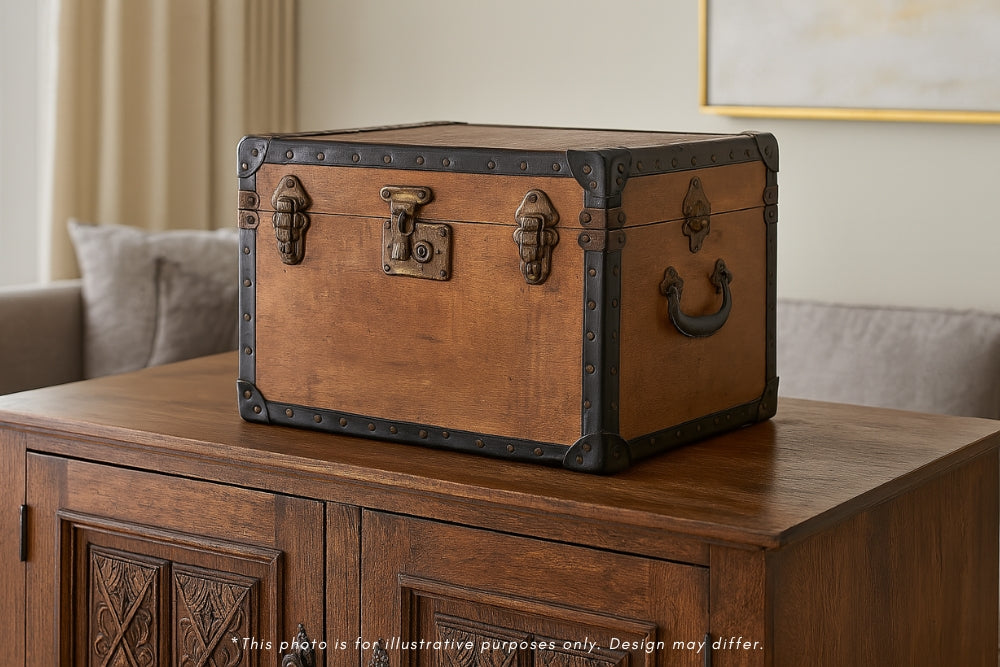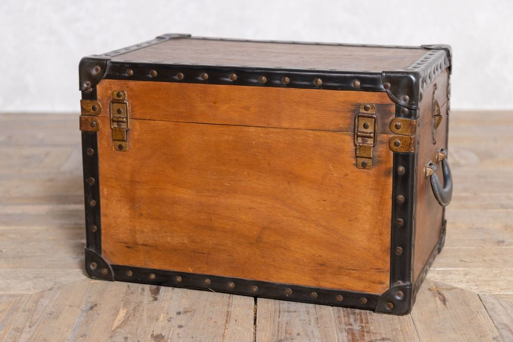 This vintage wooden trunk features metal hardware and a rich brown, wood exterior, serving as both a coffee table and side table. Perfect for storing newspapers and magazines, this compact chest adds character to any living space while providing practical storage and function as a distinctive furniture piece. This piece features unique patina and wear patterns that tell a story of its past, making it not just furniture but a conversation piece with history.