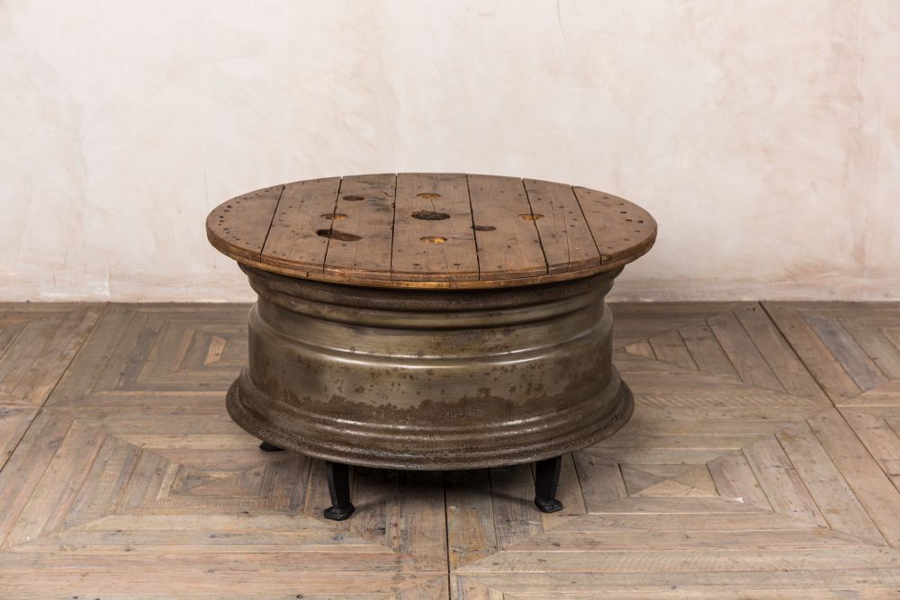 This vintage wheel coffee table is certainly an unusual find! Once a tractor wheel, it has been fitted with a reclaimed wooden top to create a quirky industrial piece of furniture.