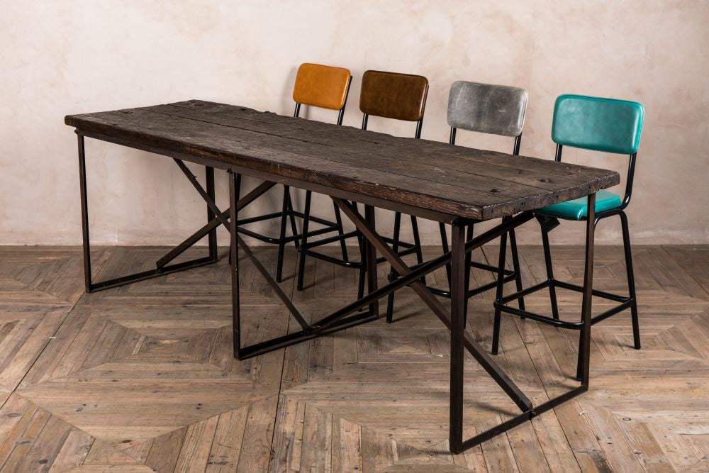 With an original dark wooden rustic top made from large, pitch pine planks and a metal frame, this mid-height table can fit 8 stools, with an extra 2 on the end for up to 10 people.