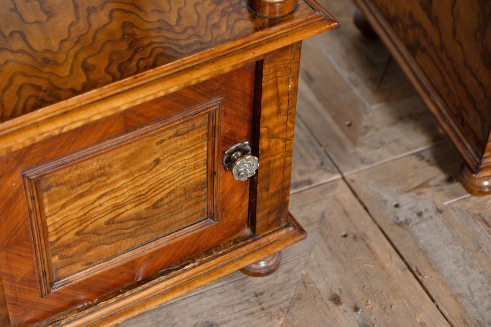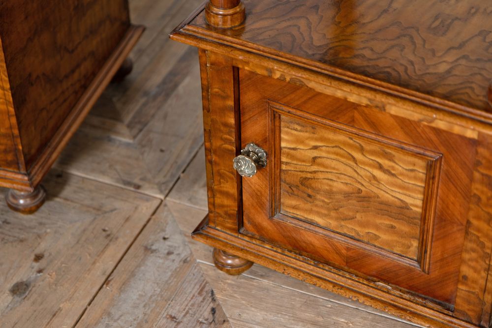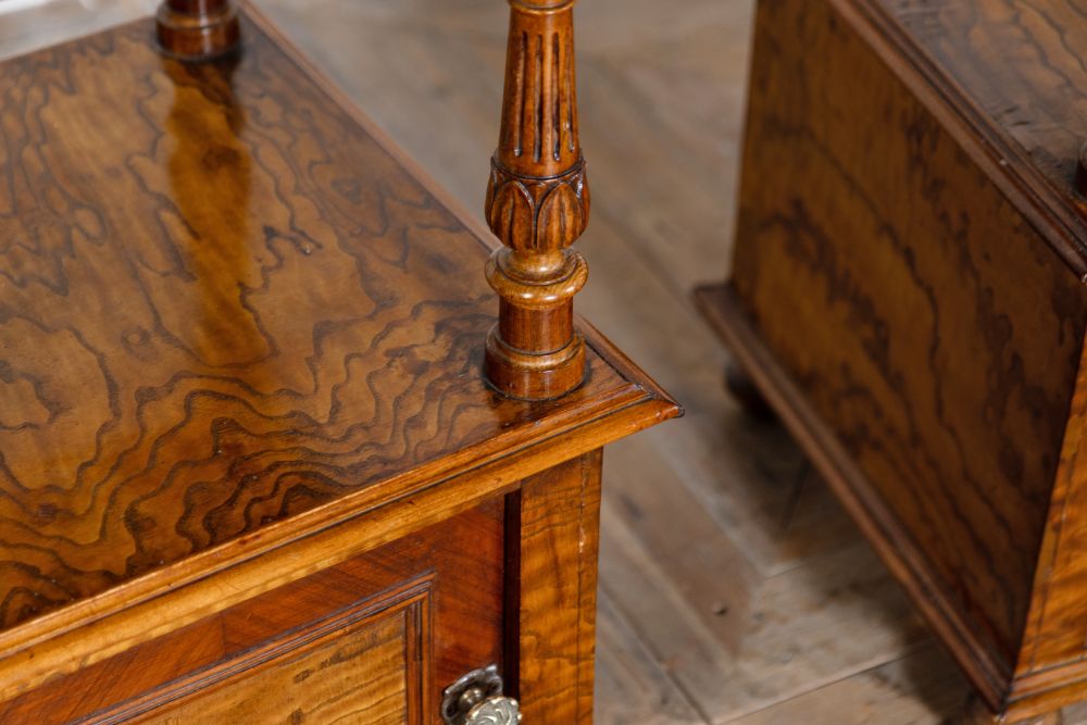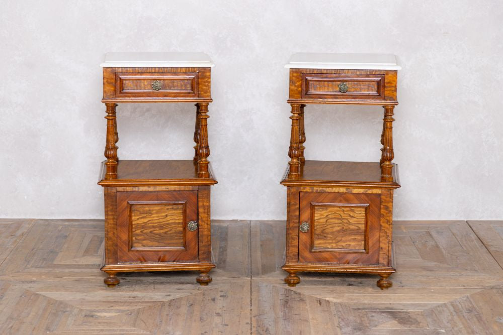 This elegant pair of Victorian bedside cabinets feature pristine white marble tops and richly figured walnut wood bodies. Each piece showcases exceptional craftsmanship with ornate turned columns, providing architectural interest and authenticity. The cabinets feature storage compartments behind beautifully grained walnut doors, all supported by classic carved feet. The stunning and unique pattern in the walnut veneer adds visual intrigue, while the crisp white marble tops offer both luxury and practicality. These sophisticated bedside tables would make perfect lamp tables or end tables, combining timeless design with functional storage.