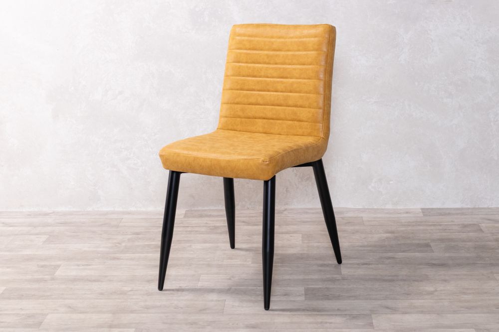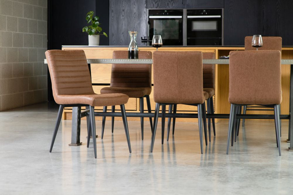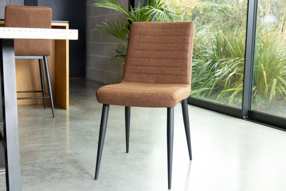 Invite minimalistic style to your interior with the Woodstock Dining Chair. The sophisticated style is enhanced by the beautiful faux leather, rich, warm tones and sleek, ribbed stitching that carries an element of vintage charm which sets it apart from the rest.