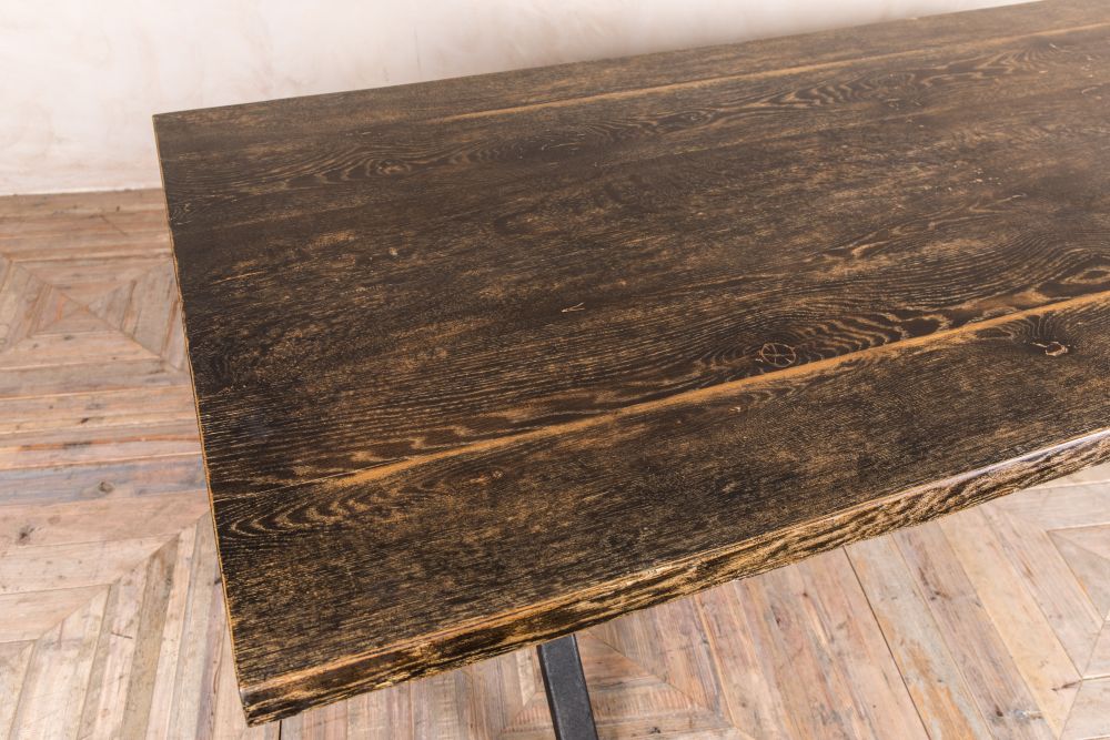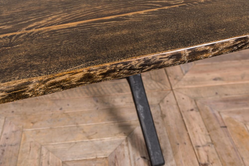 The table has a cast iron base in an upside-down Y-leg design. The rustic oak top has a dark finish, which adds to the table’s industrial appearance. The top is made from carefully selected solid timber with beautifully unique knots, marks and grooves, adding even more industrial charm to this distinctive table.