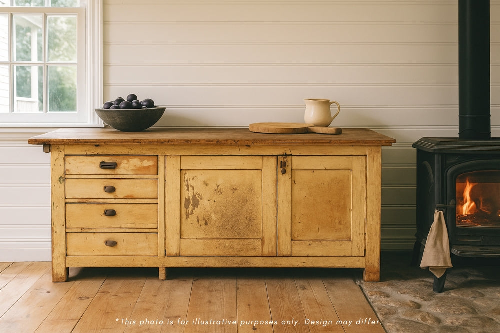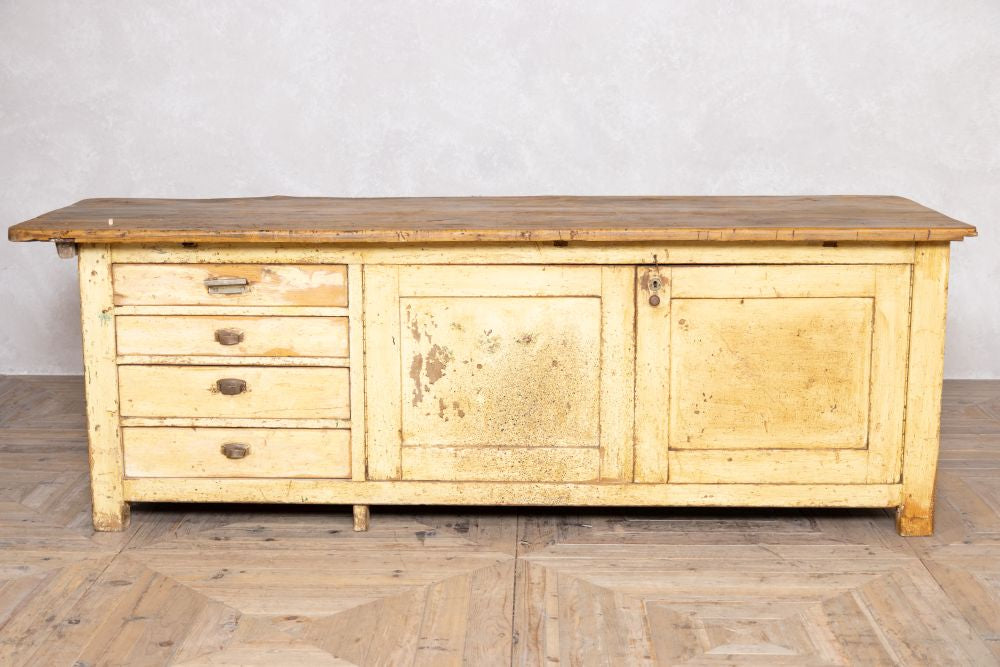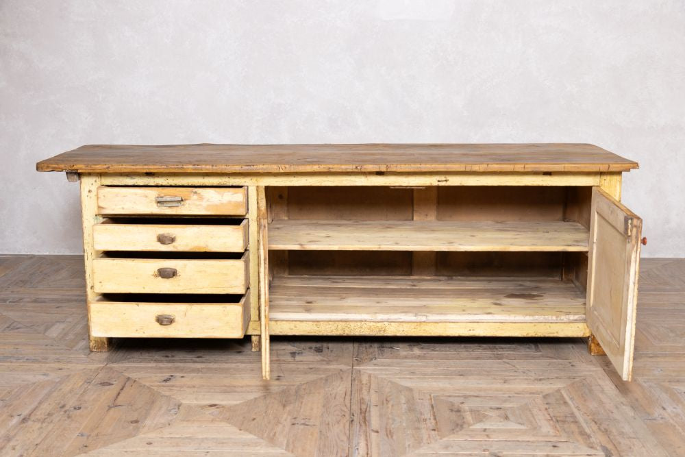 This authentic Circa 1920s Pine Workbench showcases the quality craftsmanship of its era. The warm yellow patina developed over decades gives this piece its distinctive character and charm. Featuring a solid construction with practical storage elements, this workbench demonstrates both durability and functionality. Perfect for use as a statement piece in contemporary interiors or as a functional work surface in commercial spaces, this antique workbench brings historical character to any space.