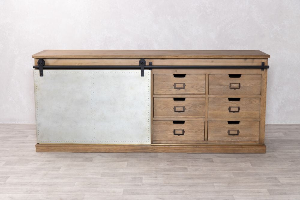 Made from good quality oak and pine, this large sideboard is an industrial statement piece for a dining room, living room or large hallway. The door slides with ease on a steel rail, opening to reveal a matching internal shelf with zinc or copper wrapping, and the drawers feature recessed handles and card holders.